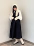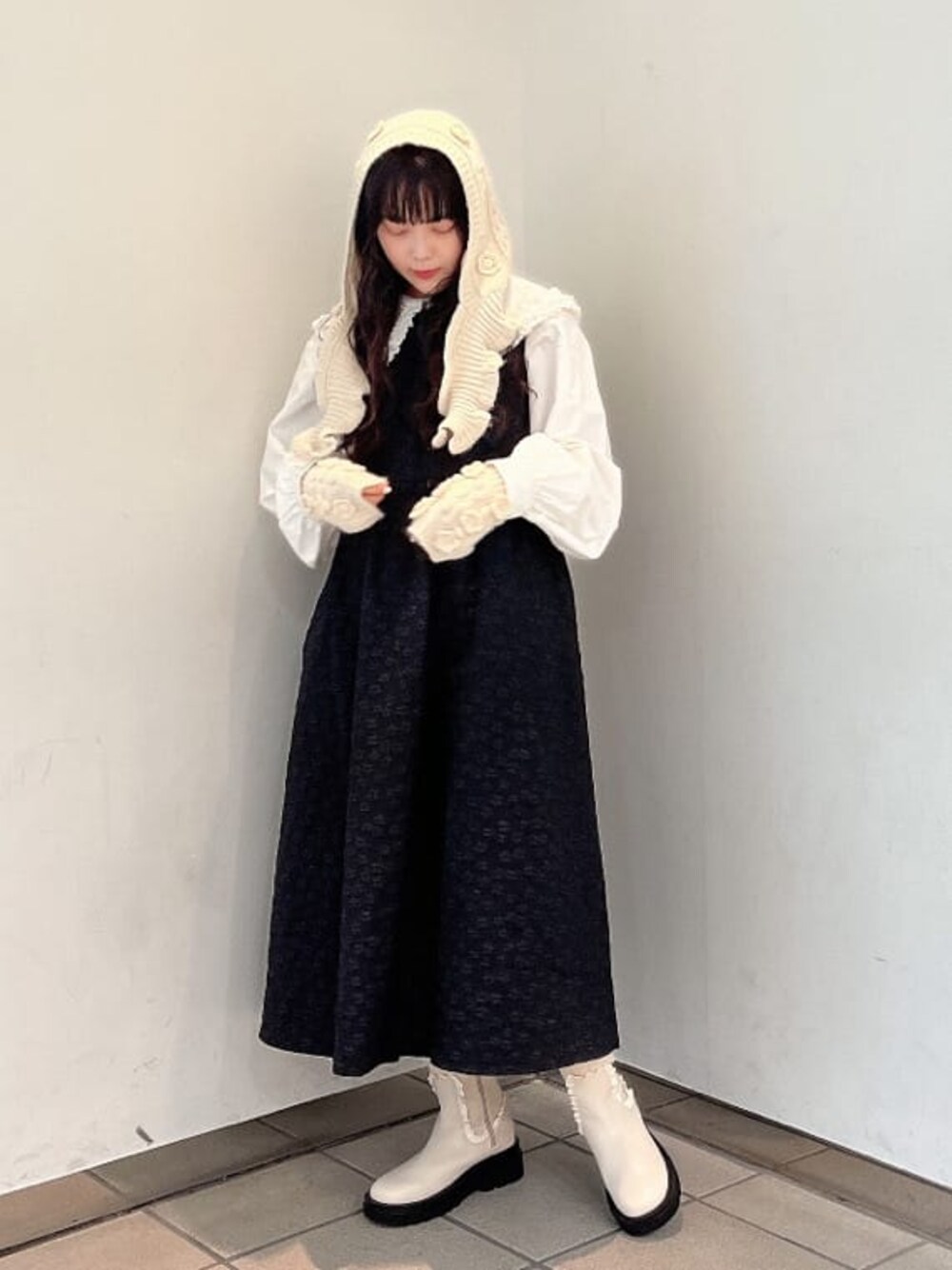 ~秋のニット小物コーデ~ 白と黒のモノトーンで合わせてまとまりのあるコーディネートにしました!少し固めの生地感のブラウスは大きな襟が特徴的。シンプルなのでどんなお洋服にも合わせやすいです◎ワンピースは少しハリのある生地なのでボリューム感があり、着た時のふんわり感が可愛らしい1枚♡秋らしさを出してくれるニット小物は同じデザインなのでセットで付けると統一感が出て更に可愛らしくなりますよ♡