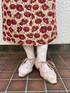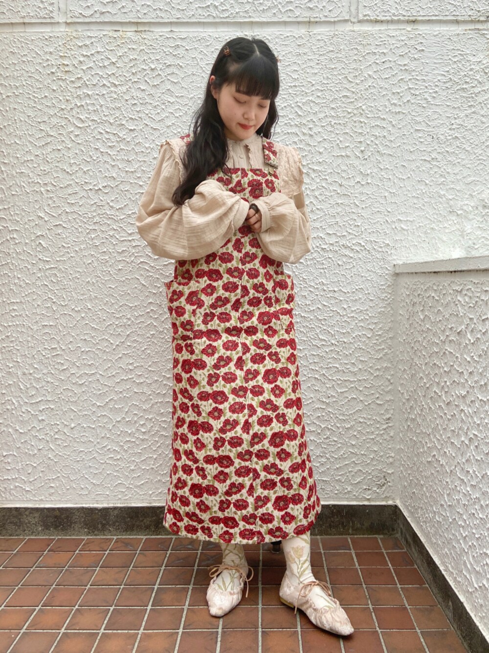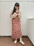 個性的で真っ赤なお花柄のジャンスカが目をひくコーディネート!ジャンスカは すとん としたシルエットなのでスラッと背を高くみせられ、後ろに大きなスリットがあるのでとても歩きやすいです。肩紐で調整出来るので高身長の方にも低身長の方にもオススメ!ブラウスはコットンなので気温が高い日でも涼しく着られます!羽織でも着られるので着回し様々。全体的に同系色で合わせ、まとまりのあるコーディネートにしました!
