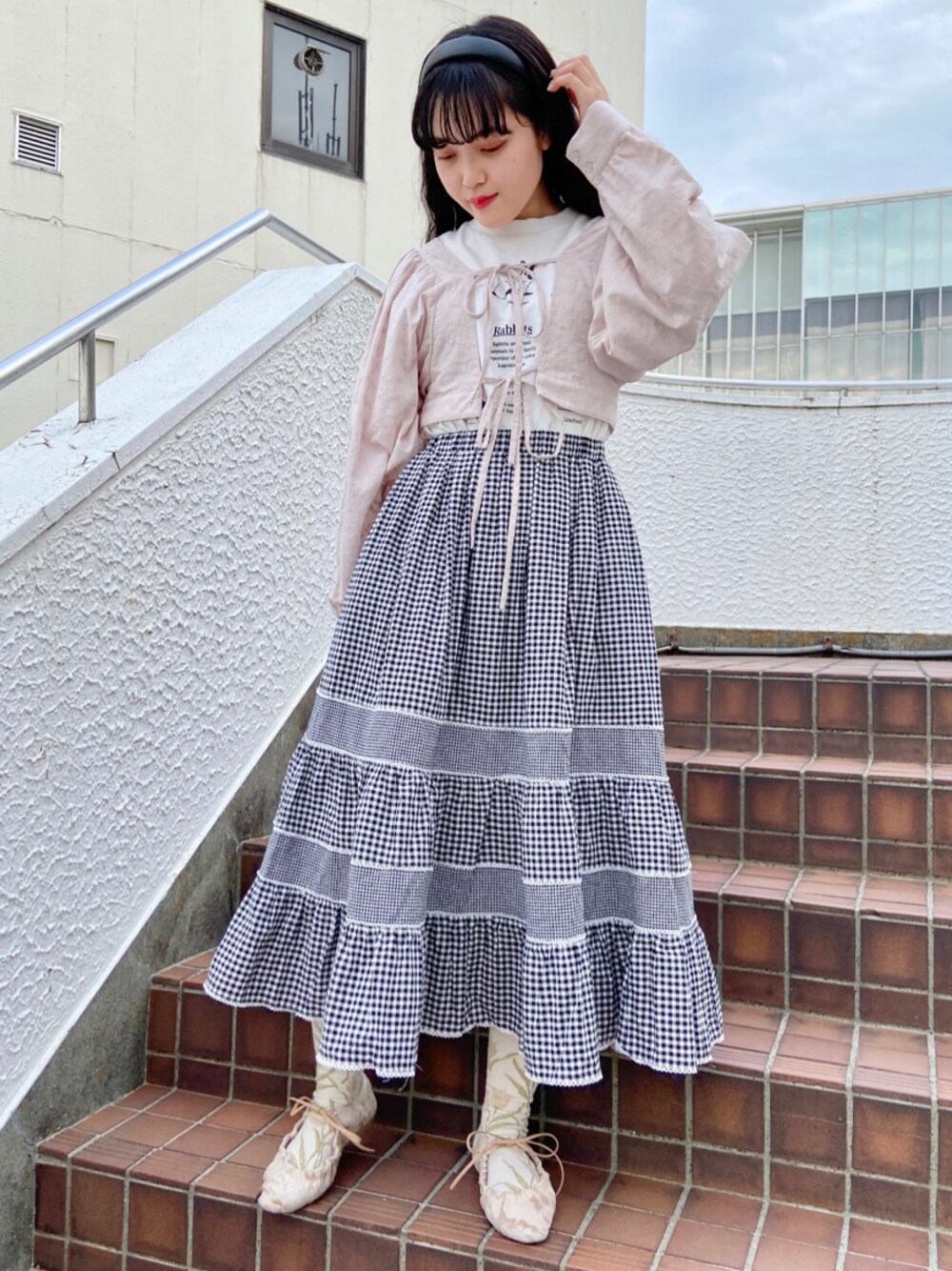 ︎︎◌春のピンクコーデ︎︎◌ 色々な種類のうさぎさんが描かれている可愛らしいTシャツに大小異なるギンガムチェックが遊び心のあるスカートを合わせました!プラスで春らしさを演出するためにピンクのビスチェとフラットシューズを合わせ一気に春らしさを◎白黒コーデにピンクの差し色を入れたまとまりのあるコーディネートです!