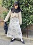 ◌秋に向けたレイヤードコーデ◌大きなレースの襟が特徴のブラウスをポイントにしたガーリーさんにオススメのコーディネートです!トップスはブラウスにカーディガンをレイヤードさせ可愛らしい印象になるようにしました!またブラウスの襟がレーヨンと綿で出来ている為、柔らかくふんわりとした印象にもしてくれます♡肌触りもとてもよいですよ!カーディガンは胸元に猫ちゃんが♡またカーディガンもレーヨン出できているので肌触りがとても良くずっと触っていたくなってしまいます!ふわふわです!袖がたっぷりしているので冬に厚めのインナーを重ねて着ることも出来ます!長い間着ていただけます◎スカートは手書きで描かれたようなラフなお花が可愛らしいツイルスカート!ハリのある生地なのでAラインのシルエットがしっかり出てくれるのでウエストが細く見えます◎丈感は156cmでくるぶしあたりまである長めのスカートです。小物はブラウスの襟に合わせてBLKを選び統一感を出しました♡