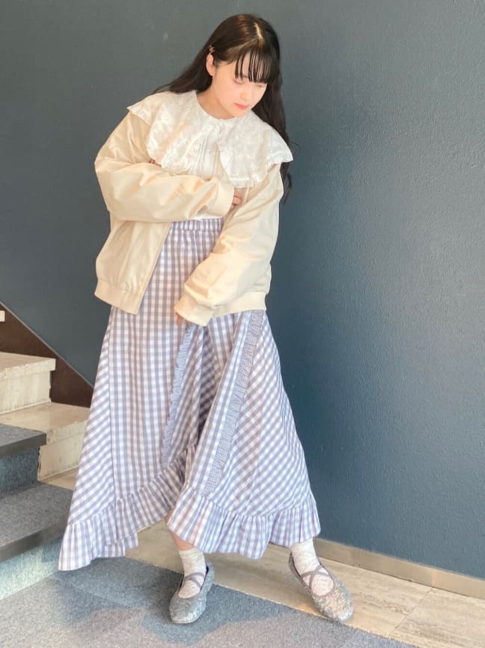 ◌ガーリーなブルゾンコーデ◌カジュアルになりがちなブルゾンをガーリーに着たい方にオススメのコーディネートです!トップスはバックに犬の刺繍がされたブルゾンにお花の刺繍がされた大きな襟が可愛らしいブラウスを合わせました◎カジュアルに見えがちなブルゾンでも一気に可愛らしいガーリーな印象に♡またブルゾンは大きめに作られているので冬場は中にニットやトレーナーを合わせてもゆったり着られるので長い期間楽しめそうですね♡スカートはアシンメトリーな裾が特徴的なギンガムチェック柄のフレアスカート。アシンメトリーになっているので縦ラインが綺麗に出て細く見せてくれます!またウエストがゴムなので脱ぎ着しやすく、とっても楽に着られます◎156cmの身長で左右の丈感はくるぶしあたりまであり、前後はふくらはぎの真ん中くらいの丈感です!今回のコーデはお出かけ中にアウターを脱いでも可愛らしいので安心してお出かけできますよ♡