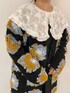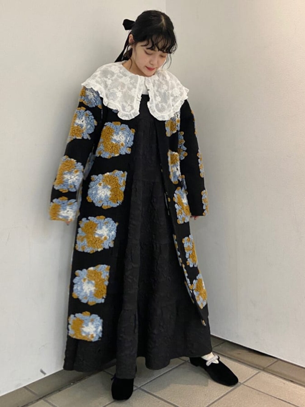 ◌大人ガーリーな大柄コートコーデ◌華やかな大柄のコートをメインにしたコーディネートです!主役のコートはブルーとオレンジのなんともいえない柄が整列している個性的な1枚。ふわっと立体感のある柄なので暗くなりがちな冬のコーデを明るい印象にしてくれます◎丈感は156cmでふくらはぎの真ん中あたりの長さになっております!ワンピースは生地をたっぷり使ったふんわりとしたキャミワンピ。長めの丈感になっているので低身長の方は肩紐を結んで頂けると今回のように丈感気にせず着られます!少し結んで頂くだけで丈感変わるので低身長の方も諦めずに挑戦してみて下さい!トップスは襟が透け感のある花柄レースになっているブラウス。大きな襟なので小顔効果にも◎写真のようにノーカラーのコートと合わせる時は襟を出しても可愛いですよ♡小物はベロアで合わせ冬らしさを演出し、統一感を出しました!