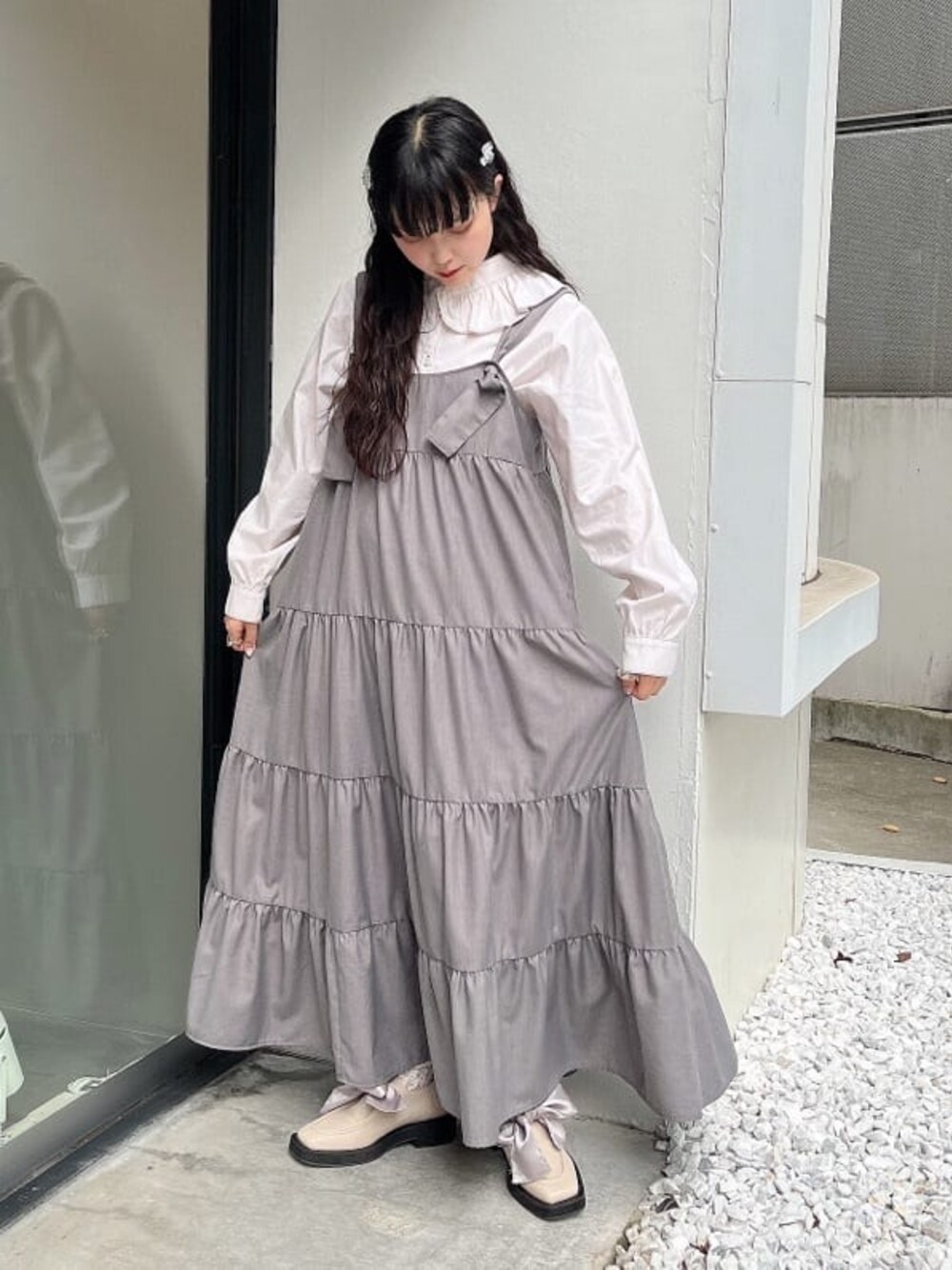 ~ふんわりコーデ~ ボリュームたっぷりのティアードワンピースはストラップが個性的な1枚。長さの調整も可能なのでどんな身長の方にもおすすめです◎同じ色合いのシューズを合わせて統一感を出しました♡