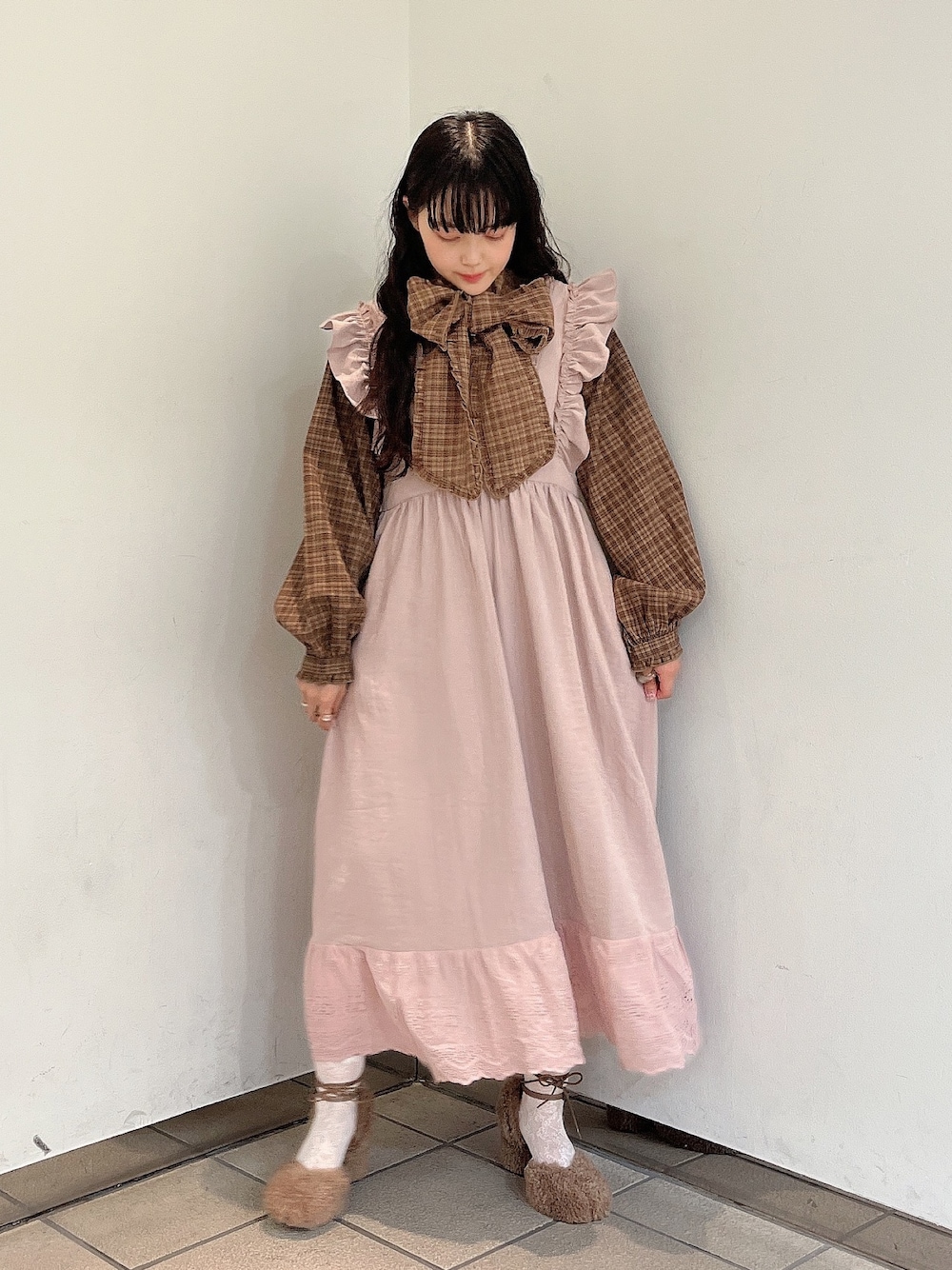 ~ カラーコーデ ~ 暗めのカラーアイテムを組み合わせた、秋にぴったりのレイヤードコーデ。 ボウタイリボンとワンピースのフリルでガーリーに。 シューズはブラウスと合わせてブラウン系を選び統一感を出しました◎