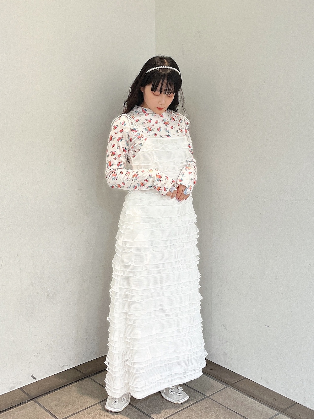 ~ 大人ガーリーコーデ ~ 細身シルエットが女性らしい印象にしてくれるキャミワンピースに花柄のインナーを合わせてガーリーに。 甘さ控えめなので大人コーデがお好きな方にもおすすめです♡