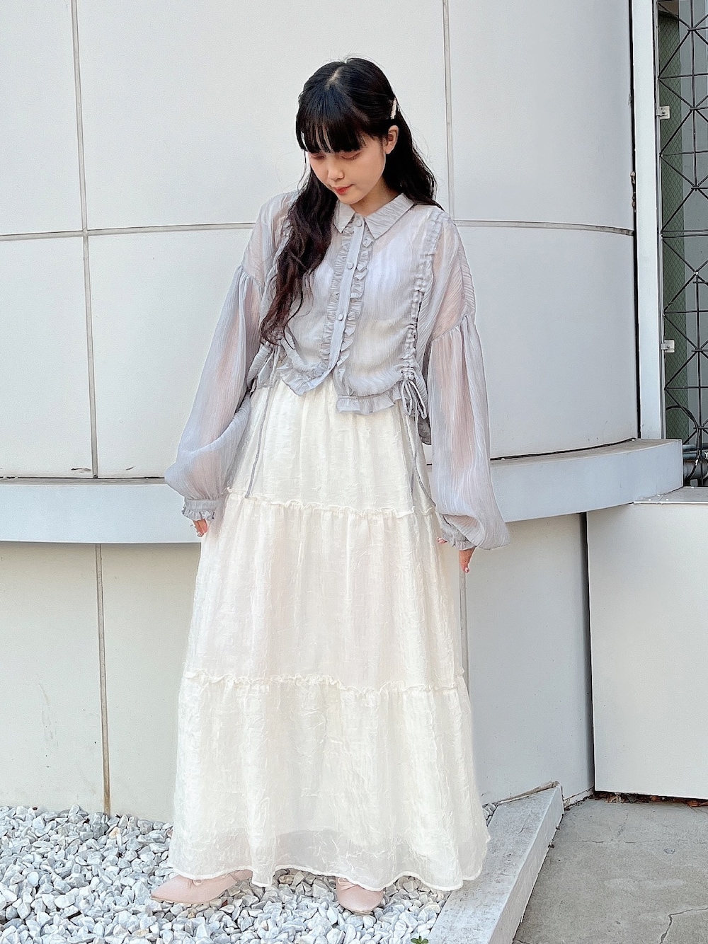 ~ 春のシアーコーデ ~ 透け感のあるシアーアイテムを組み合わせ、ふんわりとした印象に。 ブラウスのギャザーはリボンで調節出来るので、その日の雰囲気によって変えられます◎ 足元にピンクのパンプスを入れて春らしく仕上げました♡