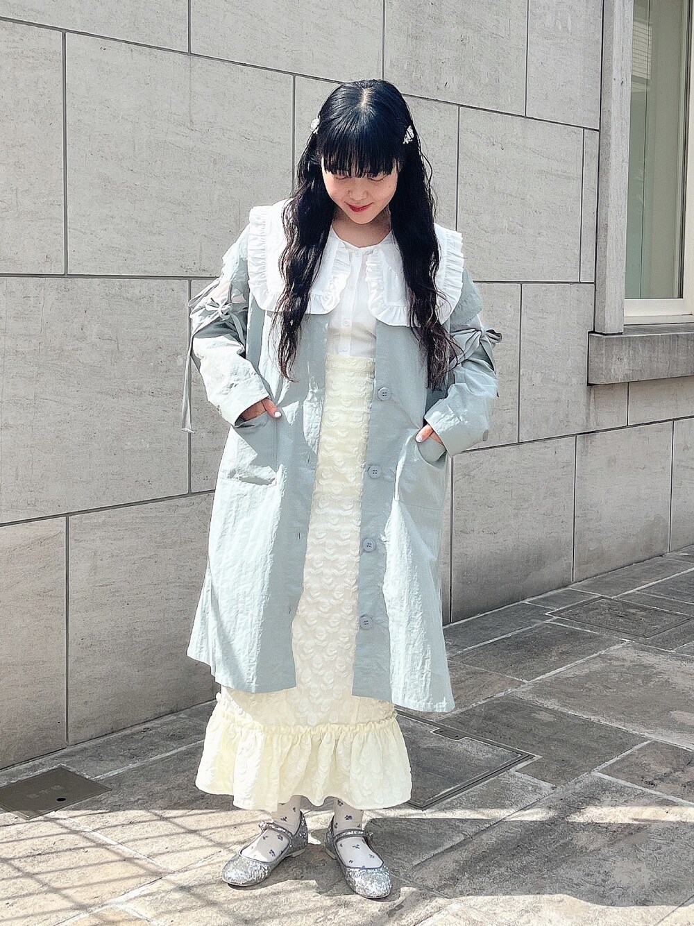 ~ 大人ガーリーなトレンチコーデ ~ 雨の日などの少し肌寒い時期におすすめなトレンチコートコーデ! 大人っぽいトレンチコートですが、ブラウスの襟を出してガーリーな印象に。