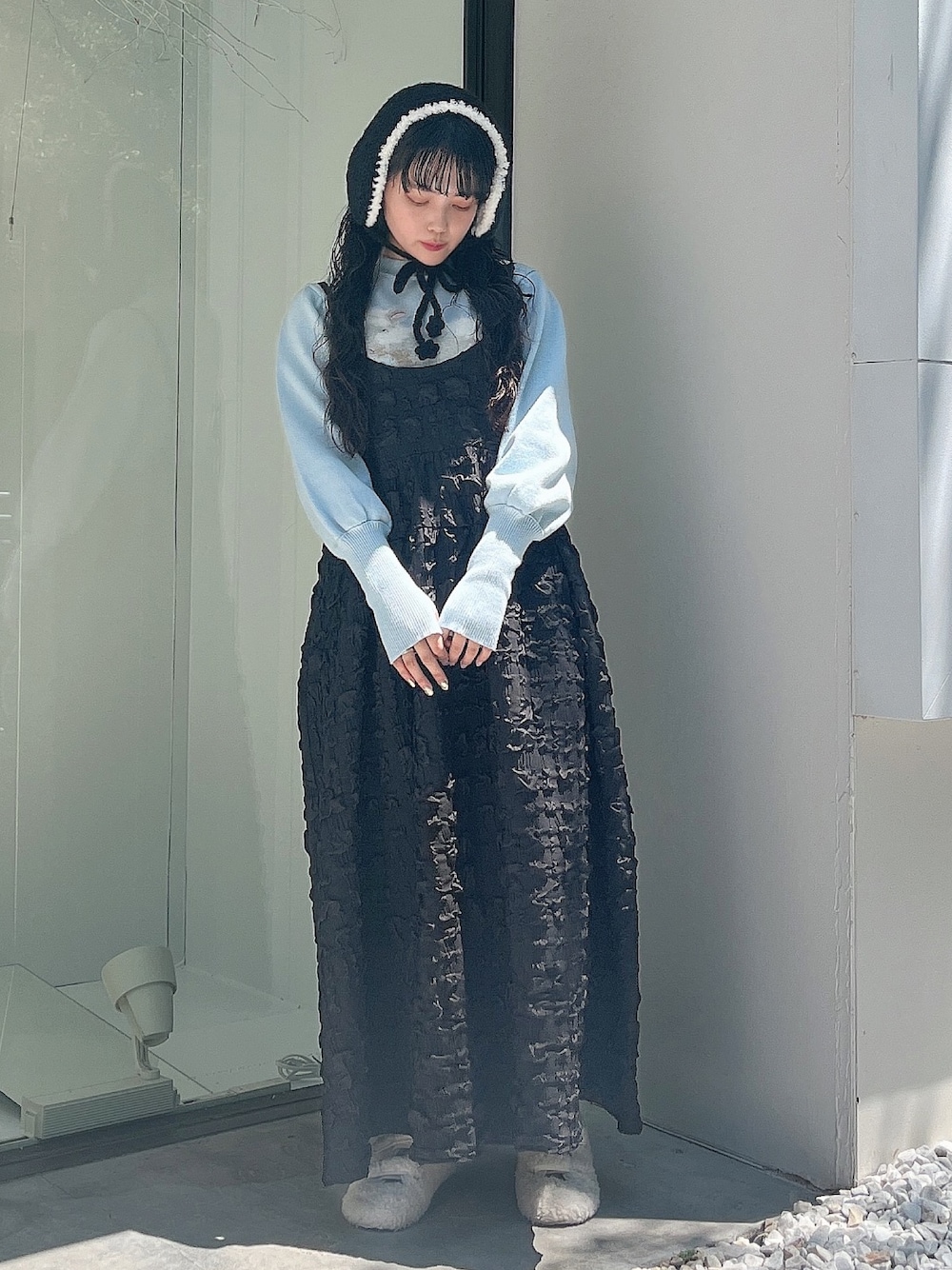 ~ ブルー×ブラック ~ 大人ガーリーなブルーブラックコーデ。 アジャスターで楽に調整出来るふんわりボリュームのキャミワンピースにひつじが描かれたタイトなニットトップスを合わせて大人ガーリーに仕上げました! 甘さを出したい方はイヤマフにもこもこシューズを合わせて更にガーリーさをプラスしてみて下さい◎