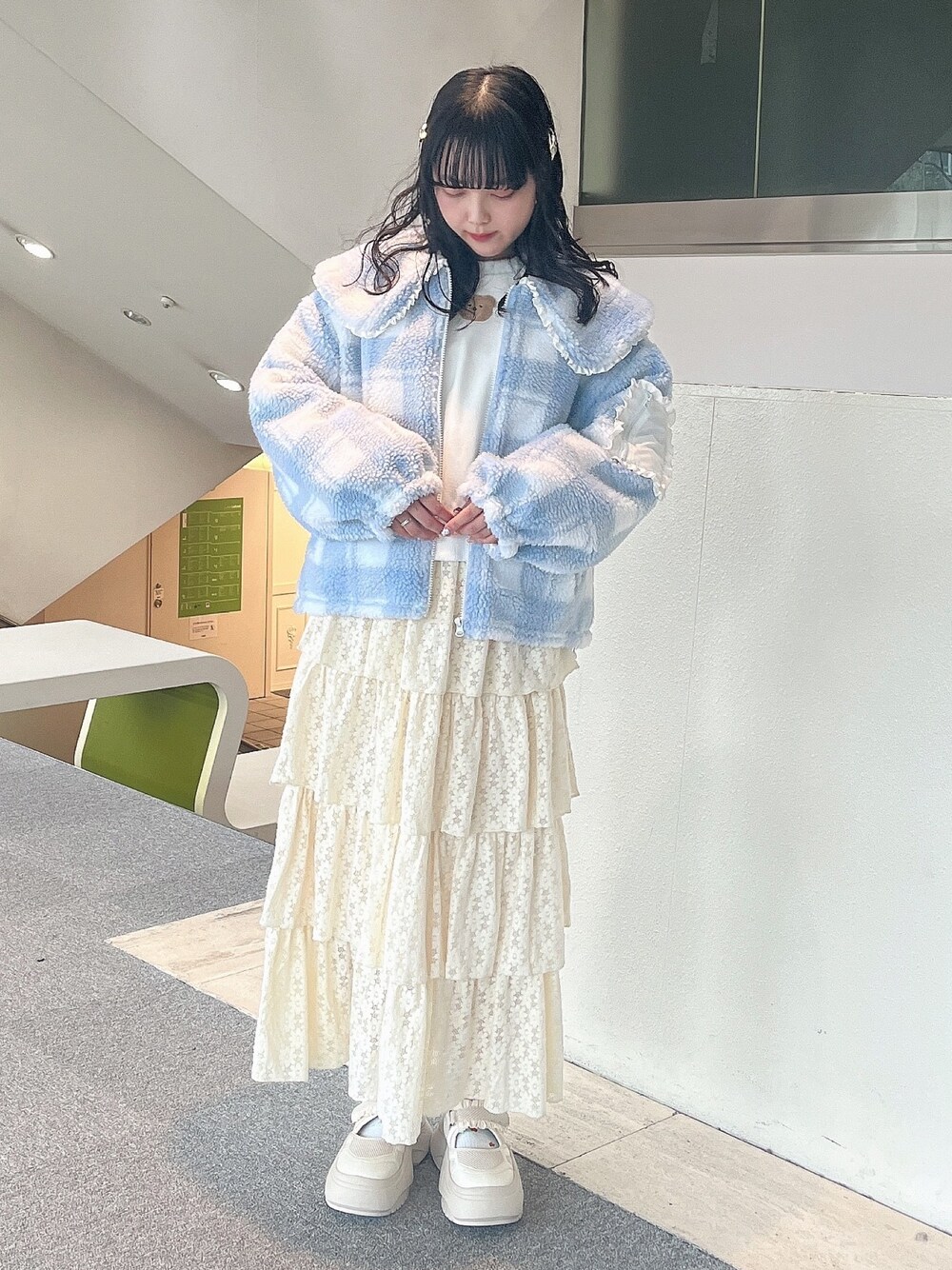 ~スタイルアップコーデ~ 丈感の短いアイテムや厚底シューズを合わせた脚長効果バツグンコーデです◎ ウエストくらいの丈感のスウェットはインをしなくても1枚でさらっと脚長効果に。ボアジャケットもヒップより少し上くらいの丈感なのでアウターを着てもスタイルアップに! コーデのバランスが気になる方や丈感が気になる方はどんなコーデにも合わせやすいメッシュスニーカーがオススメです♡
