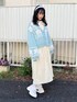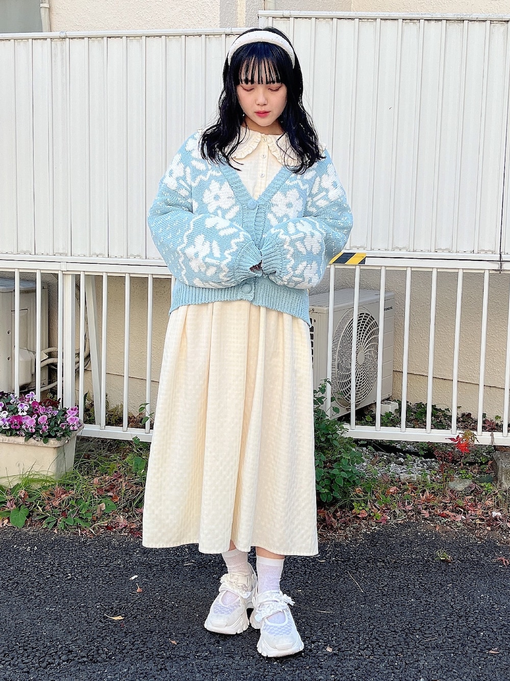 ~春のカラーコーデ~ 春らしく明るいイエローのワンピースにブルーのカーディガンを合わせた春カラーコーデ♡ ギンガムチェックのワンピースはウエスト位置が高めなので脚長効果に! 胸元にワンポイントくまちゃんが刺繍されているので1枚で着た時にも可愛い♡ カーディガンは少し厚手なので冬から春先まで長く着て頂ける1枚。vネックデザインなのでスッキリ見せられます◎