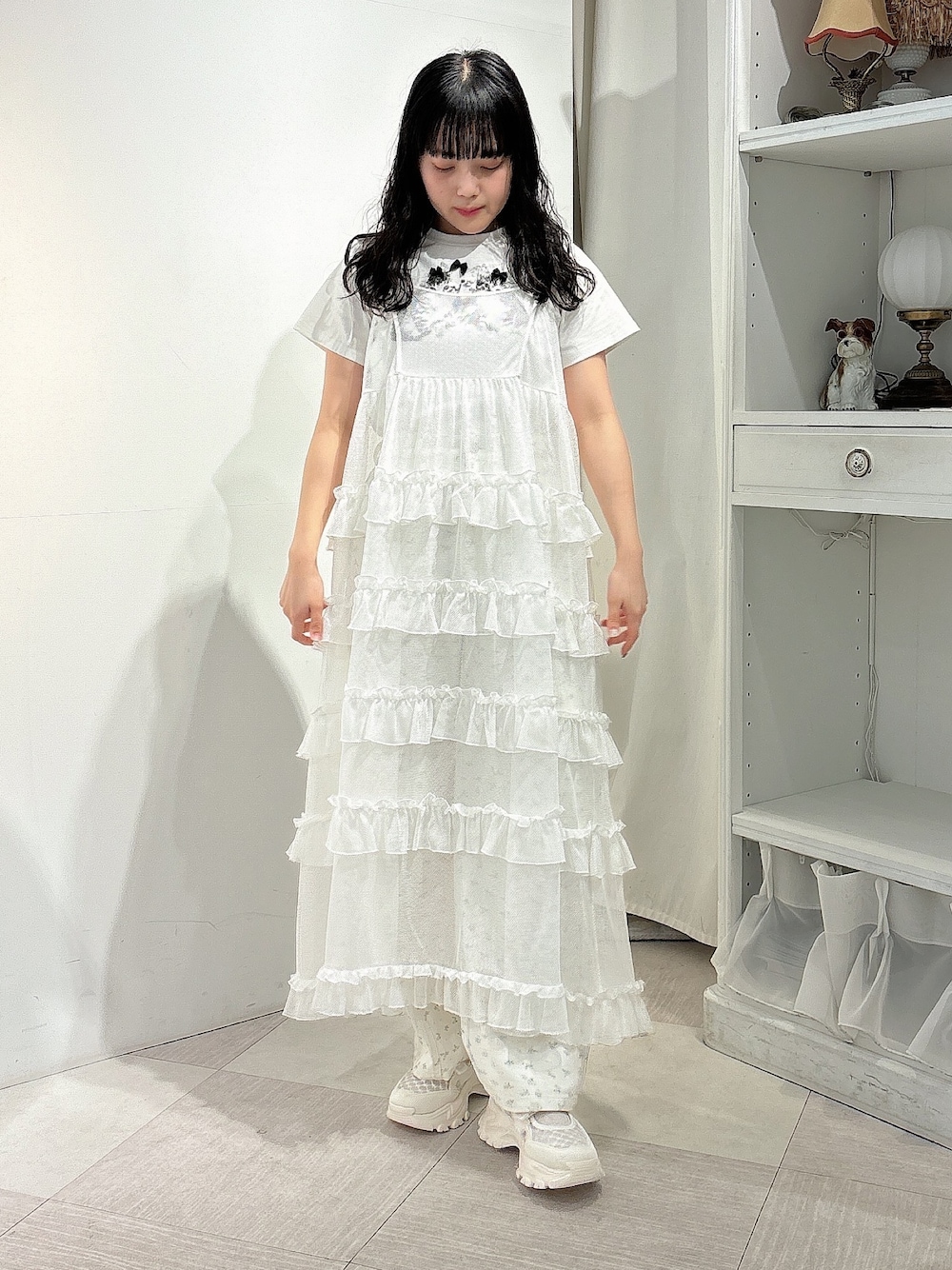 ~ガーリーなTシャツコーデ~ コンパクトなTシャツにフリルたっぷりのメッシュワンピースを合わせたカジュアルガーリーなレイヤードコーデ! Tシャツはこねこがプリントされた可愛らしいデザイン。立体的なリボンが付いている少し変わった1枚です♡ パンツは小花柄のカーゴパンツ。少し太めのストレートシルエットなので甘くなりすぎずカジュアルにも着こなせます◎ 主役のメッシュワンピースはフリルたっぷりなカジュアルガーリーなキャミワンピース。どんなコーデにもプラスで合わせやすく、1枚重ねるだけでコーデに華が出ます!コーデにワンポイント欲しい時にオススメです◎