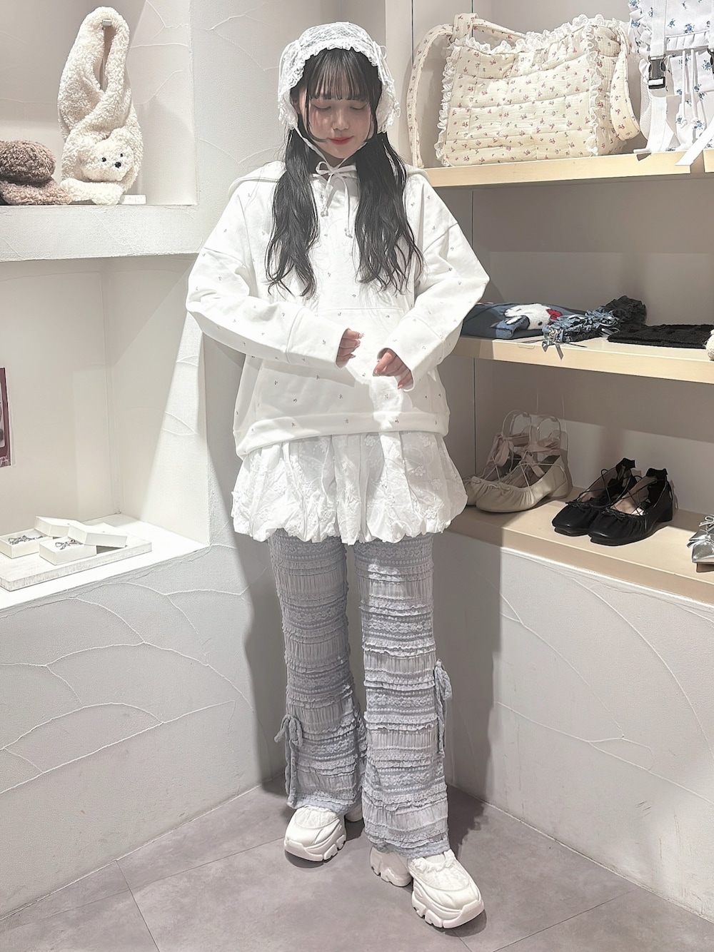 【トップス】 セーラー襟がデザインされたスウエットはガーリーさんも可愛らしくスウェットが着られるので楽ちんにオシャレさんになれます♡ポケット付きで優秀な1枚です! 【パンツ】 フレアなデザインで脚長効果抜群のレースパンツはどんなコーデにも合わせやすい1枚。所々足元にリボンが装飾されている所も個性的で可愛らしい、足元まで抜かりないオシャレさんになれます♡ 【スカート】 ふわっとしたバルーンシルエットが可愛らしいミニスカートをレイヤードさせてオシャレさんに♡ミニ丈苦手な方でもパンツ合わせでオシャレに合わせるのがオススメです♡