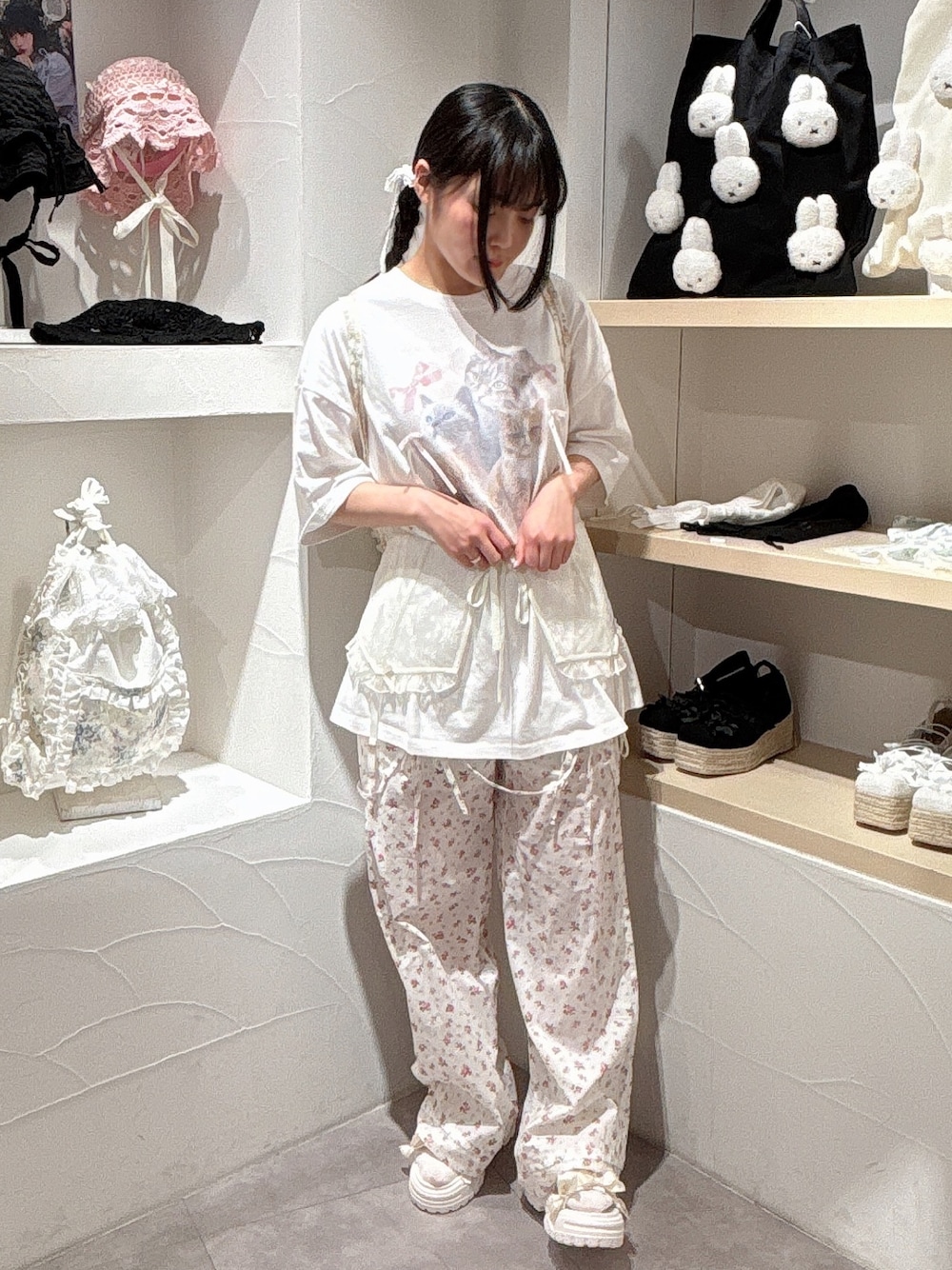 ガーリー好きの方でもパンツ履きたい!という方におすすめなパンツスタイル♡ 花柄のパンツはリボンもデザインされている個性的な1枚。かっちりしすぎていないのでラフにTシャツなどに合わせて楽かわいいコーデに♡ ワンポイントプラスしたい方にはコルセットもつけて頂くと上級者コーデになります!
