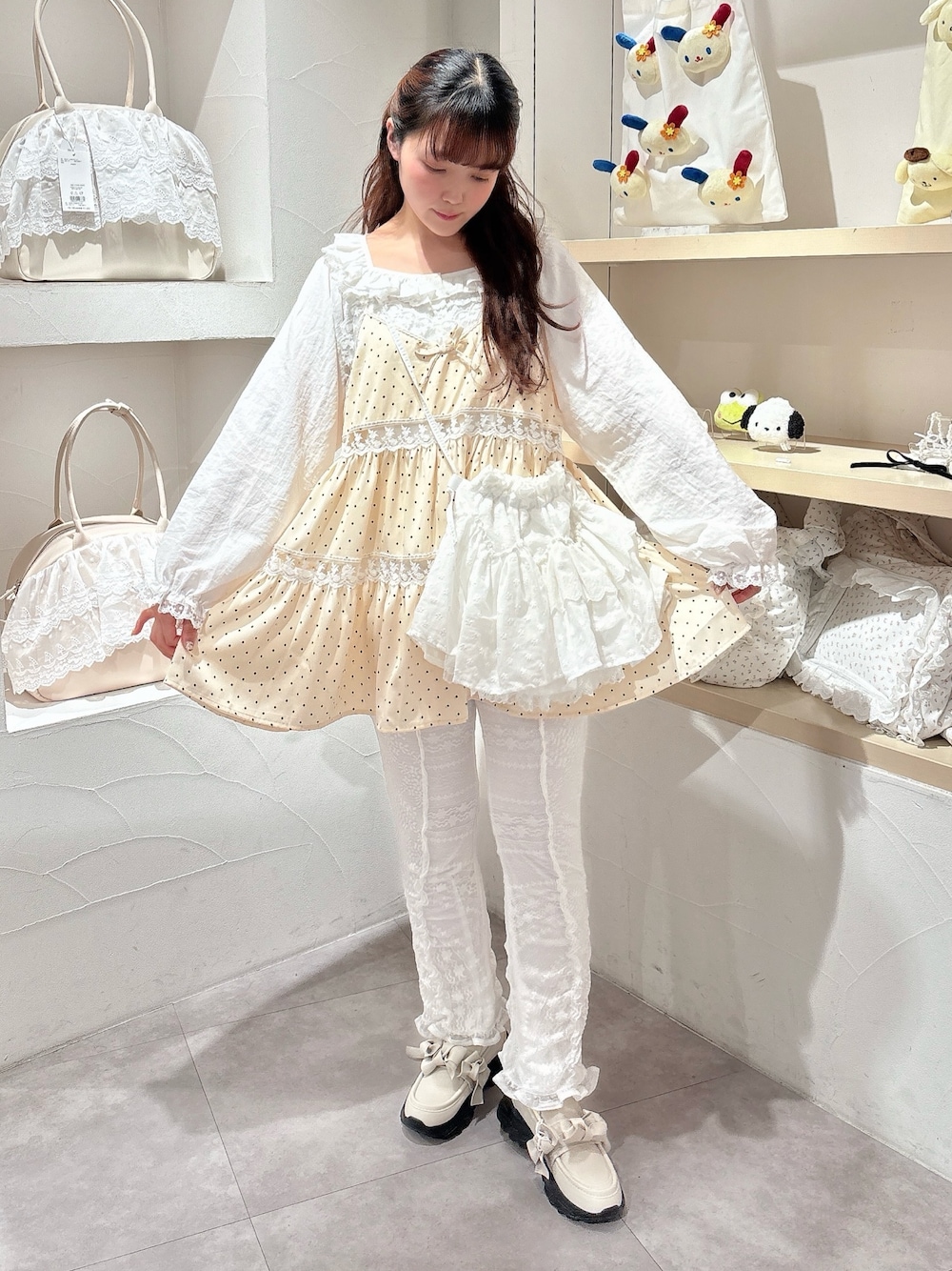 【チュニック】 トレンド感のあるドット柄のベビードールは長さの調整も出来るのでどんな身長の方でもちょうど良い丈感で楽しめます◎ ブラウス合わせでワンピースのように着ても、トップスの下に着てミニスカートのように見せて着るのもオススメです! 【ブラウス】 首元がすっきりとしたブラウスは一枚で着ても可愛らしいですが、インナーとしても大活躍、間違いなし!一枚で着る際はウエストにリボンがついているので細く見せてくれます!インナーとしては小さめな襟を出して着るのもオススメです◎ 【シューズ】 ゆるっとしたリボンが可愛らしいローファーはスニーカーソールでとても軽いシューズ。軽くてクッション性もあるのでとても歩きやすいローファーです!23.5cmでMサイズを着用しております!