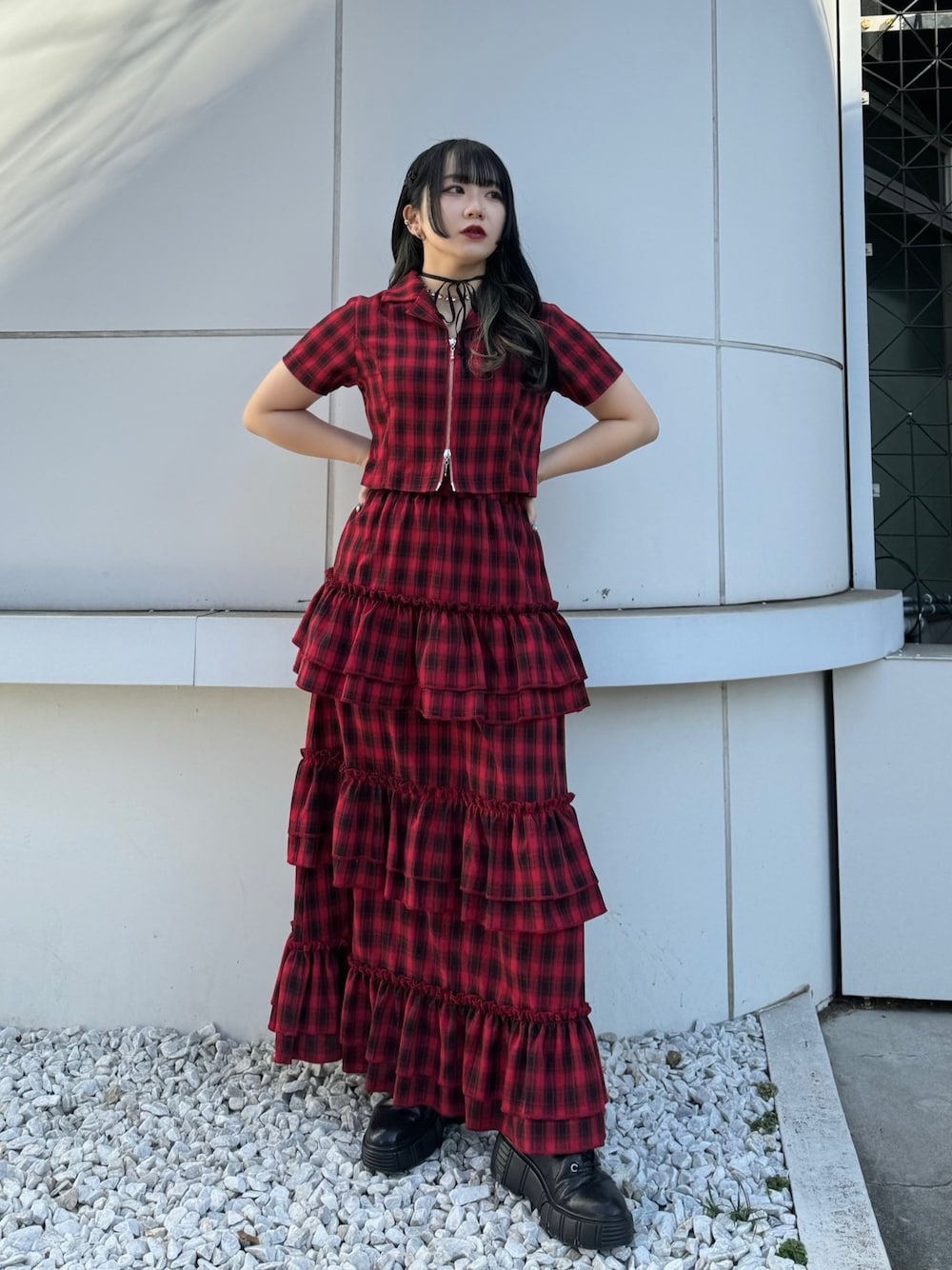 ⋆⸜ jouetie定番赤チェックコーデ⸝⋆ コンパクトなトップスとボリュームのあるスカートでバランスの良く着用頂けるセットアップ♡॰* スカートは身長153cmでくるぶしくらいの丈感です。 シャツはダブルZIPで開けて着用すると抜け感が出せるのもポイント✮