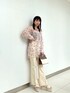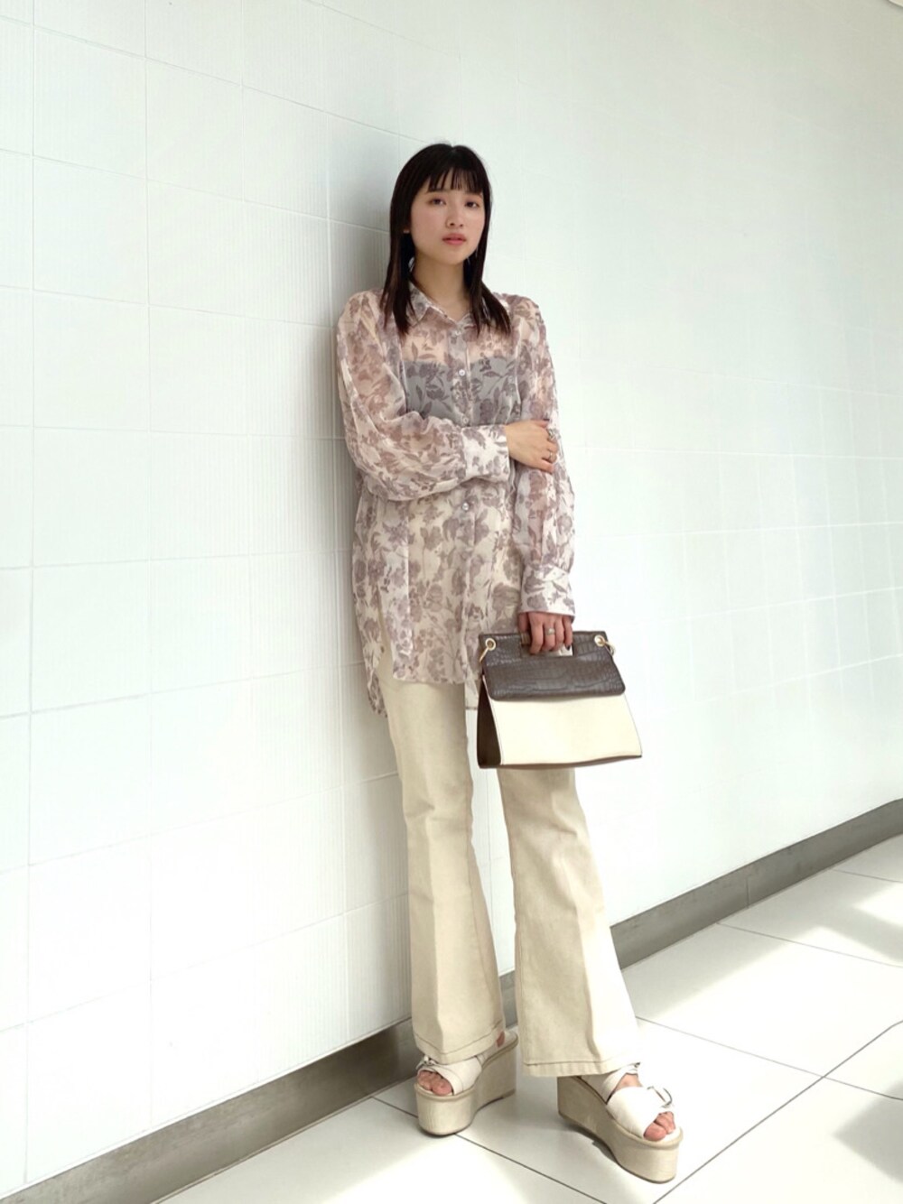 人気のシアーシャツに周りと差がつく花柄が登場!花柄とさりげないゴールドラメでさらに華やかな印象になります。ムルーアオリジナルカラーで仕上げたフラワープリントは落ち着いたカラーなので、柄の主張も少なく、他のアイテムをシャツと同系色でまとめたコーデにすると、柄物が苦手な方でも挑戦しやすいです! 私は前を全部閉めてトップス風で着ました。白のハイウエストパンツで合わせてより涼しげなコーデに仕上げました!
