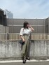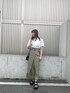 ムルーアらしいアシンメトリーデザインのスカートに惹かれてコーデを組みました! 裾のシアープリーツが上品なラップスカート! 更にシアープリーツは、光沢感がある素材なので目を引くポイントです。中に膝上のインナーも付いてるので、透け感などは気にせずお使い出来ます。 ウエスト部分は、ゴムとベルトが付いてますのでお好みに合わせて調節もしやすいです。 私は女性らしいスカートにあえてカジュアルなTシャツを合わせてラフさをプラスしました。 このTシャツはコットン100%で出来ており、着心地抜群です!1枚持っていたらデイリーに使えること間違いないです。 爽やかな白Tシャツに、大人っぽい淡めのカーキスカートで全体的に柔らかいカラーのまとまりだったので、シューズとバッグは黒を選び締めました!シューズは厚底ですがスポサンなので、歩きやすくかなり盛れるのでオススメです!夏のお出かけコーデにぴったりスタイリングです!