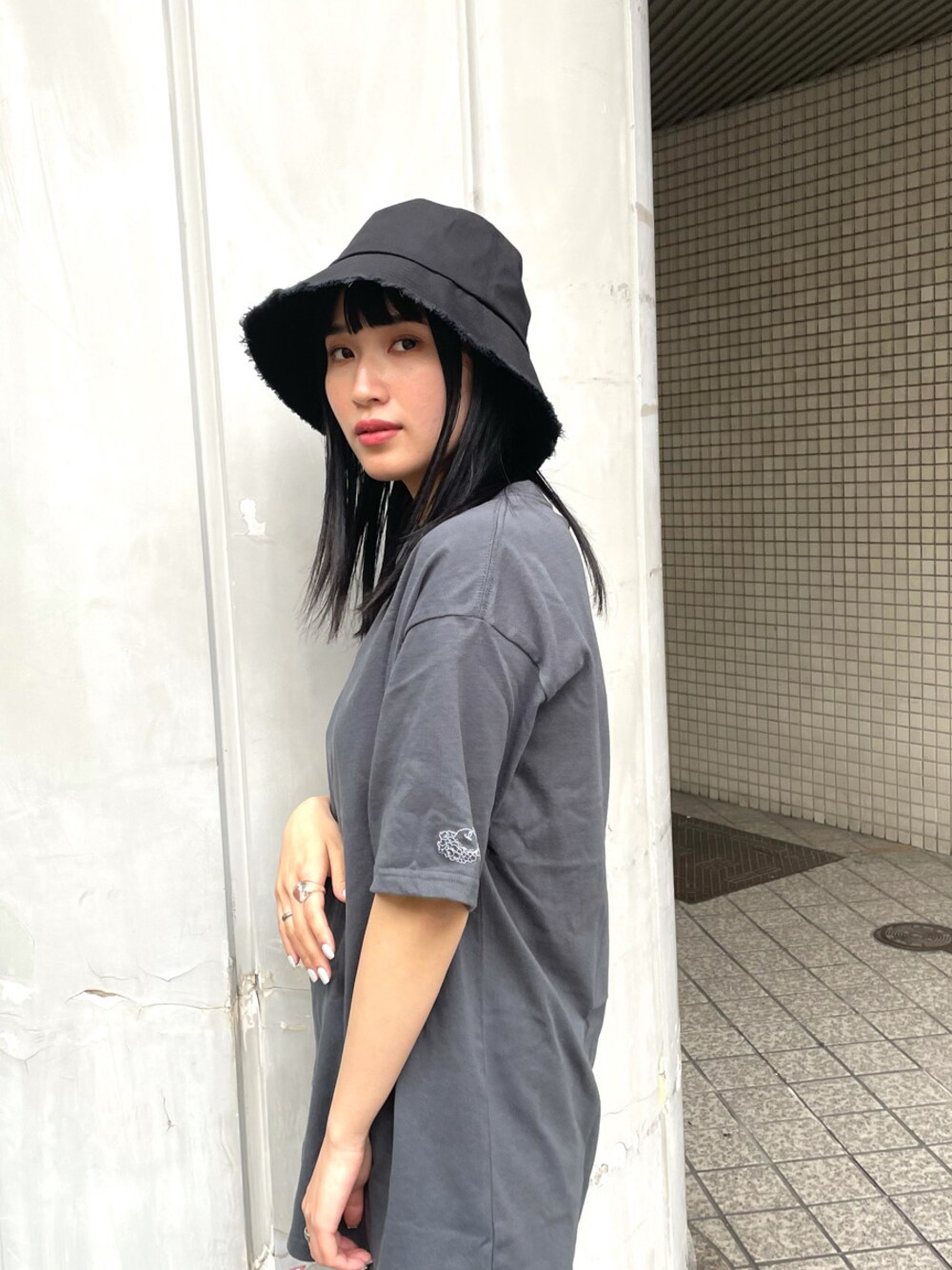 MURUA×fruit of the loomのコラボTシャツを使ったモードなラフコーデ!Tシャツはホワイトとチャコールグレーの2枚セットになっていて、サイズもホワイトがM、チャコールグレーがLのご用意になっています。チャコールグレーはオーバーサイズに着れて、お尻がすっぽり隠れる丈感です。生地はしっかりしており、透け感も気にならないです。定番のTシャツに今季トレンドのグレーをチョイスするだけでワンランク上のコーデに仕上がります。更に、左袖にワンポイントで刺繍ロゴが入っていて、こなれ感を演出出来ます。ボトムはクロシェペンシルスカートを合わせて夏らしさをプラスし、あえて黒の色味をチョイスし、モードな雰囲気を高めました。全体的にダークカラーでまとまってるけど、このスカートの素材や、インナーが膝上までなので、膝下から透けて見えるデザインが、涼しげな印象を与えてくれます。足元はぺたんこサンダルを合わせてかっこよくなりすぎないようにラフさを演出しました。近所のお散歩コーデなどに最適スタイルです!