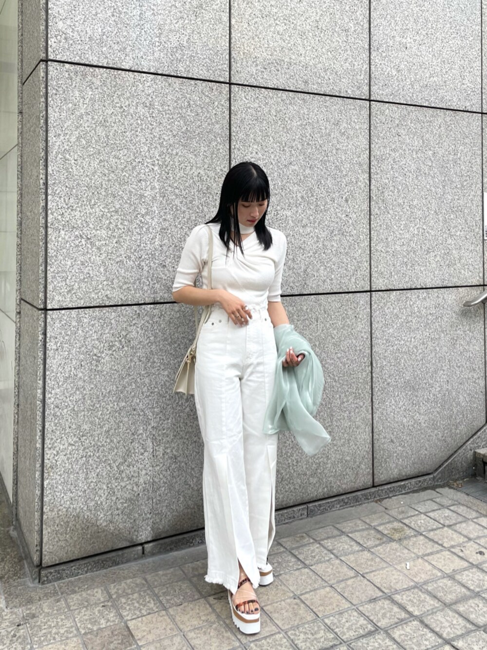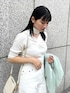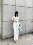 オールホワイトの女性らしいカジュアルコーデ! 胸元のツイストが女性らしさたっぷりのニット!MURUAといえばのチョーカーデザインで、チラッと見える肌見せがこなれ感を演出してくれます。 タイトシルエットなので、どんなボトムでも合わせやすい万能トップスです。私は、ワイドパンツを合わせてカジュアルコーデにしました。ホワイトで統一し、カジュアルだけど品のある雰囲気に仕上げました。パンツは膝下からスリットが入っているので、歩いた時に足首が見えるのでスッキリとした印象になります。オールホワイトに差し色でライトグリーンのシャイニーシャツを手で持ち、コーデの仕上がりを格上げさせました。日中は手持ちで、夜肌寒くなってサッと羽織るスタイルなどで使うと便利なのでオススメです!