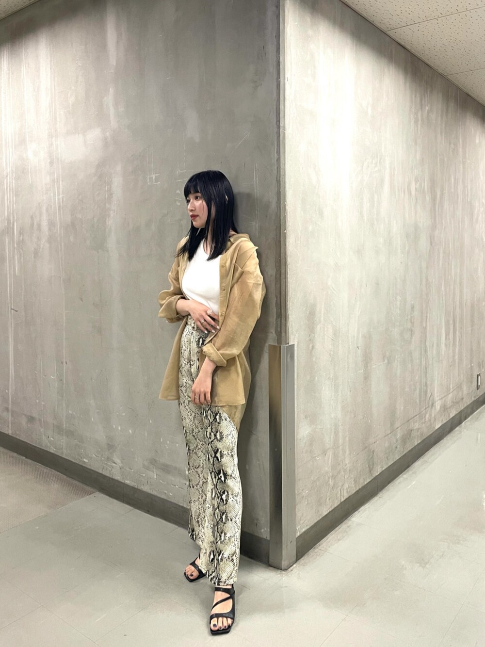 パイソン柄が目を引く個性派大人コーデ! パイソン柄のパンツはシアー素材で出来ており、とても軽い着心地です。中にインナーも入っているので透けないので安心して履いて頂けます。膝下から少し広がるフレアシルエットなので足を綺麗に見せてくれます。トップスはキャメルのシアーシャツを羽織りました。去年から大人気の新色です。肌なじみのいい色味なので、パイソン柄との相性も良いです◎オーバーサイズなデザインがコーデに抜け感をプラスしてくれます!中のインナーは白を選び、少し華やかさも足し、夏の涼しげな印象を演出しました。トレンドの服も着たいけど、周りに差をつけたい方にオススメなコーデです!