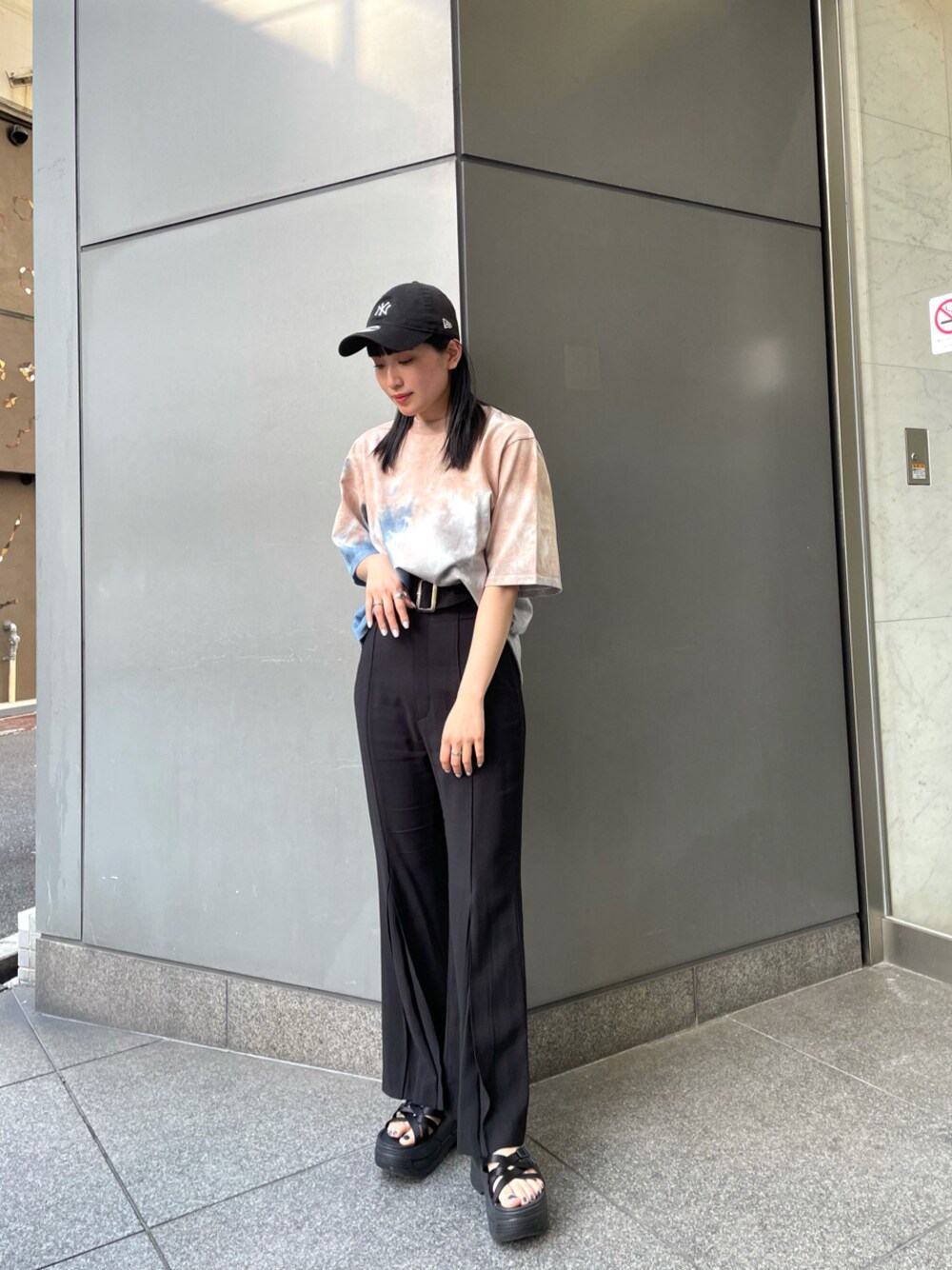 ストリートカジュアルコーデ!トレンドのタイダイ柄が目を引くTシャツは、夏のイベントなどでも大活躍間違いないです。コットン100%使用なので、着心地がとても良いです。ベーシックな形なので、パンツスタイルもスカートスタイルも様になります。袖が少し長めなので、一回折って頂くと抜け感が出るのでオススメです。私は今回メンズライクなコーデを組みたかったので、パンツスタイルにしました。メンズっぽいけど、パンツのシルエットが膝下から少しフレアになっているので、女性らしさもあり、あまりカジュアルすぎるのが苦手な方でも挑戦しやすいです。更にSHAKAとのコラボサンダルは厚底なので、脚が長く綺麗に見えます。ストリート感をプラスする為、小物はキャップを合わせました。夏イベント以外のちょっとした散歩コーデでも様になるコーデに仕上げました!