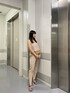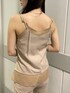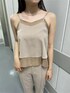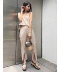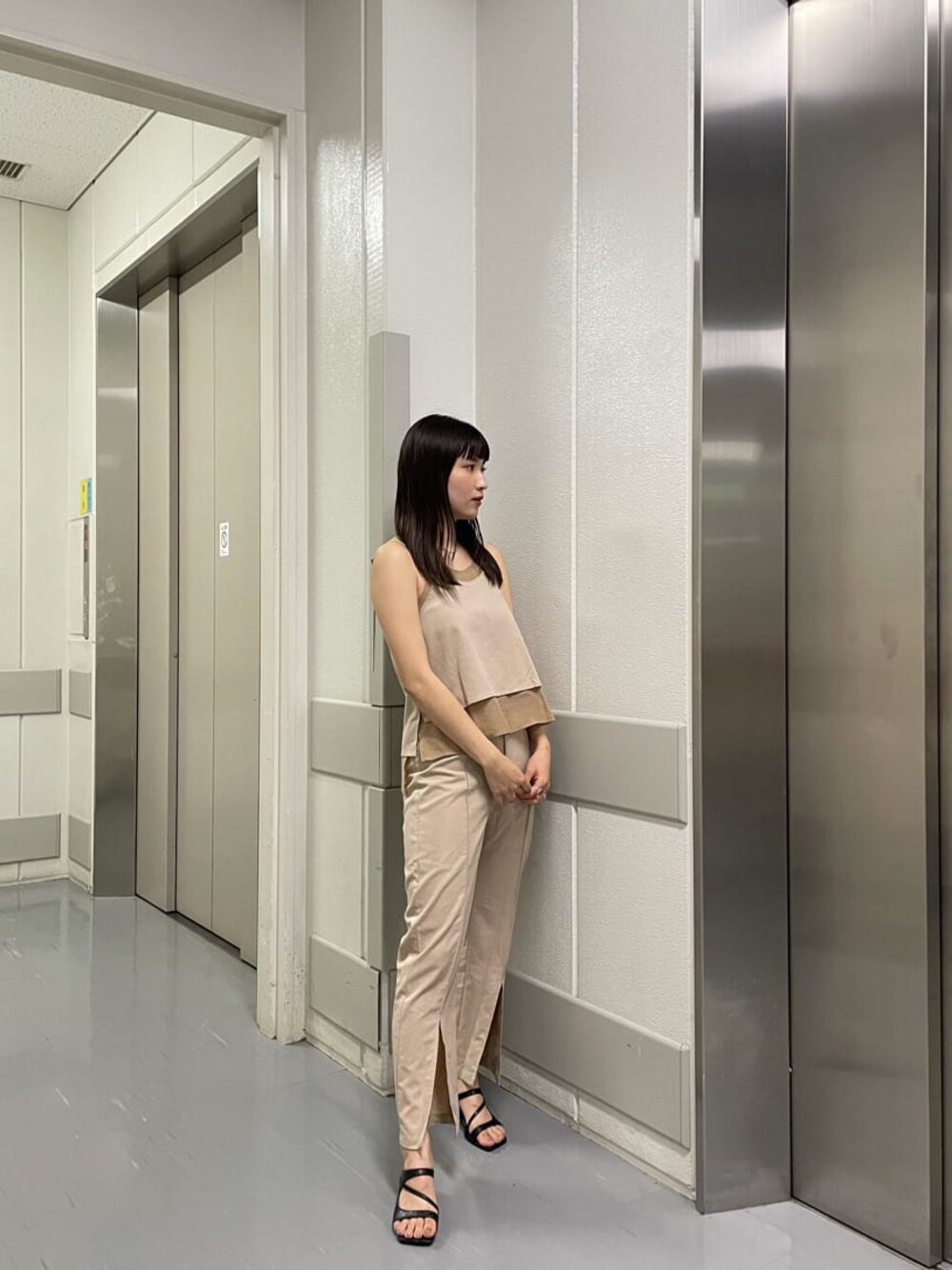 楽ちんセットアップコーデ!肌なじみのいいベージュカラーがヘルシーで夏ムード高めてくれます。キャミソールはレイヤードデザインになっていてこなれ感◎ゆったりめで生地も柔らかく、体のラインがあまりでないので1枚でも着やすいです。中にタンクトップやTシャツを重ねて着るのもオススメです。パンツはテーパードシルエットなので足が細く長く見えます。センタープレスと長めのスリットが更に縦のラインを強調してくれます。また、スリットから足首が見えるのでスッキリとした印象に。低身長の方でも足元がもたつく事なく履いていただけます。 セットアップで使うのももちろんですが、別々でもお使い出来るので夏の着回しアイテムにバッチリです。 足元は大人っぽさを出したかったので、黒の綺麗めなサンダルを合わせました。アシメのストラップと細めのヒールが品のある印象に。スクエアトゥがトレンド感もありながら、綺麗めでもカジュアルなテイストでも合うシンプルなデザインが◎