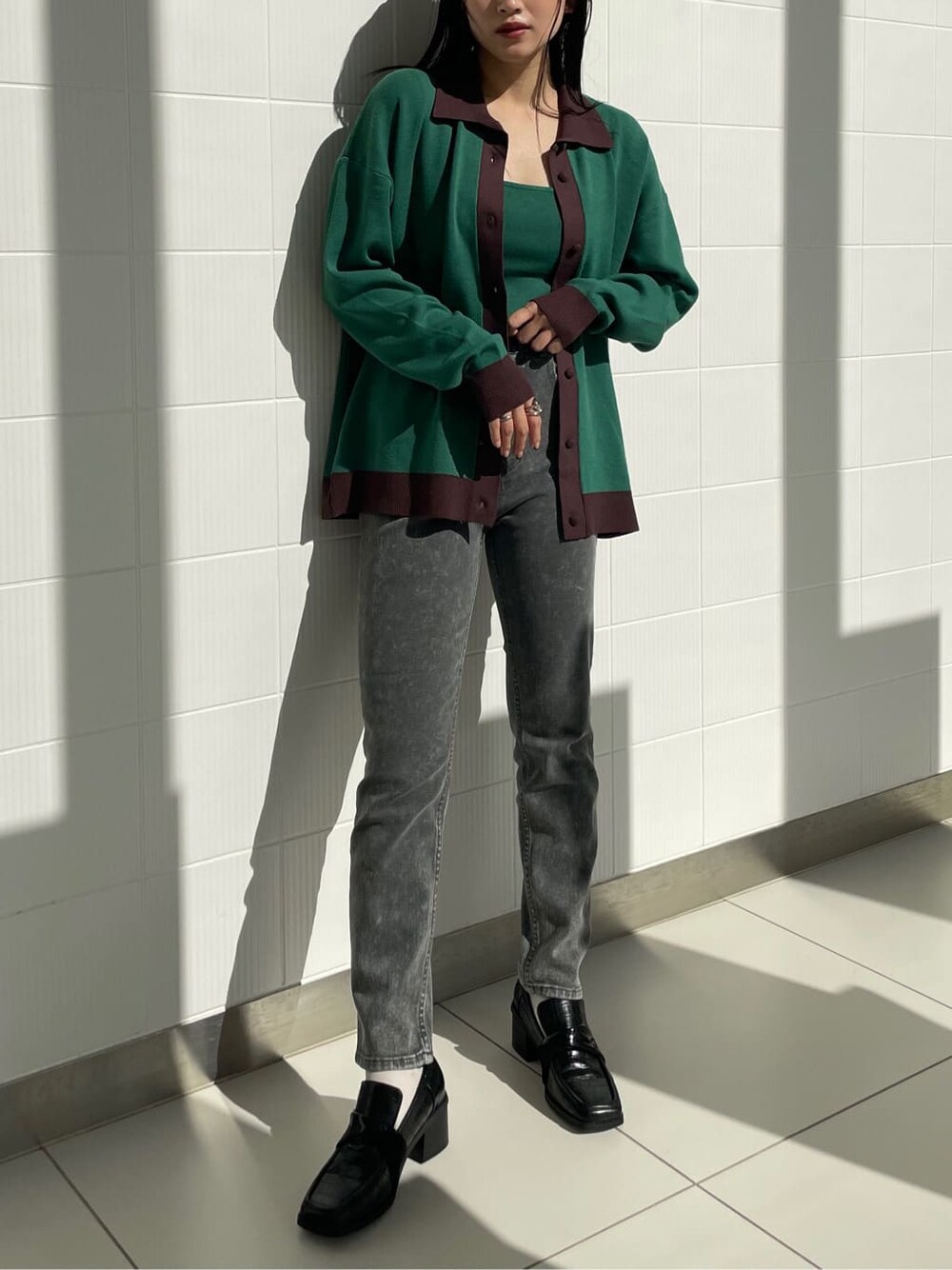 MURUA×よしミチのコラボアイテムのカーディガンとタンクトップを使ったメンズライクコーデ!こちらのカーディガンはユニセックスアイテムなので彼と兼用なども◎ オーバーサイズがこなれ感を演出してくれます。ボタンを開けて羽織りでも良いですし、全部閉めてトップスとしてもお使い出来ます。グリーンとブラウンのカラー合わせが秋ムード高めてくれます。中のタンクも同じ色味なのでより統一感が出ます。グレーのスキニーを合わせてよりメンズライクな雰囲気をプラス。足元はローファーを合わせてプレッピースタイルに。こちらのローファーは太めのヒールなので盛れますし、安定感もあり歩きやすいです。