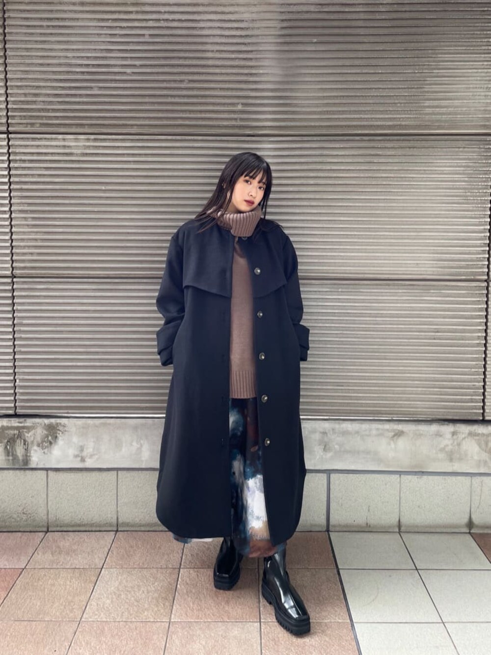 来週からいよいよ12月なのでこれから必須なコートを使ったコーデをご紹介します! こちらのコートはノーカラーのデザインなので、合わせてる大きめのタートルもごわつきにくく、首回り重く見えません。綺麗目で洗練された印象で着ていただけるので、フォーマルな場面でもお使い出来ます。裾がシャツのデザインを落とし込んでおり、サイドが少し短いです。なので中のボトムや足首もチラリと見え抜け感が出ます。低身長の方も着ていただきやすいコートです。中のタートルニットはWEB限定ニットで、お尻が隠れるくらいの長さがポイント。フレアスカートなどと合わせてゆるズルコーデが今っぽくなります。合わせたスカートは水彩のような柄が目を引きます。薄手の生地なので、シーズン問わずお使い出来ますよ。