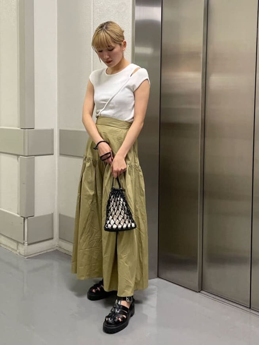 辻村奈々(MURUA)のハンドバッグ「メッシュ巾着バッグ」を使ったコーディネート