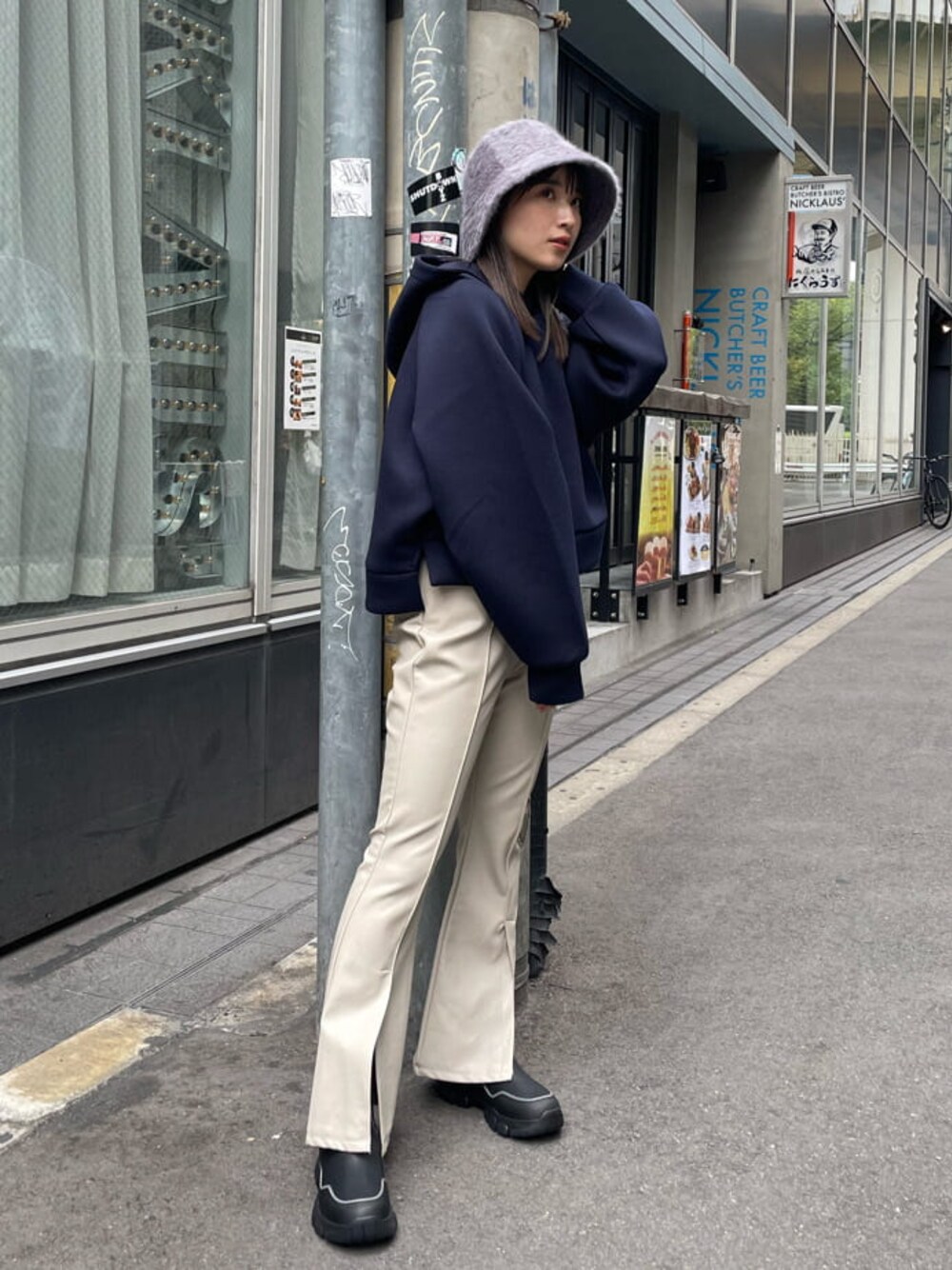 ラフカジュアルコーデ! 【トップス】毎年人気のボンディング素材のパーカー。モチモチとした素材が着心地抜群。保温性も高いので、冬場も大活躍。 【ボトムス】スタイルアップ効果◎のフィットパンツ。レザー素材が秋冬ムード高まる1枚。柔らかいレザー素材なのでストレスフリー。 【シューズ】大人気SHAKAとのコラボでブーツが登場。ステッチが入っており、スポーティーな作りでもデザイン性◎23センチで36を着用し、少し大きめでした。 【帽子】大人気のファーバケハ。ふわふわ素材が柔らかい印象に。パーカーのネイビーとパープル寄りのグレーが相性抜群。