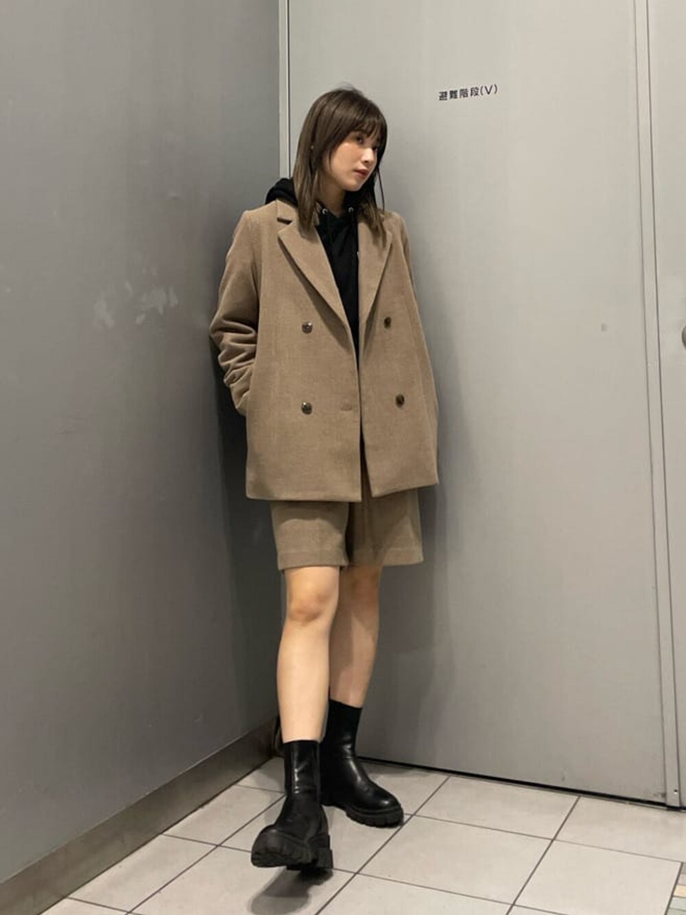 ジャケットをパーカーではずしたメンズっぽコーデ! 【ジャケット】丈感長めで、細身のシルエットが更に上品な印象に。ベーシックな色味でどのアイテムともマッチします。柔らかく保温性に優れた素材なので長く着回せます。 【トップス】定番のパーカーですが、丈が短めをチョイスしメリハリのあるスタイルに。生地はしっかりしており、分厚すぎないのでアウターの中に着やすくなっております。 【ボトムス】セットアップのハーフパンツ。膝丈が今年らしい1着。ジャケットと同様少し細身のシルエットなので品のある印象に。 【シューズ】トレンドのサイドゴアブーツ。細身の作りなので足下スッキリと見えます。どのスタイリングにもマッチするので使い回し◎
