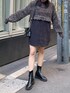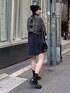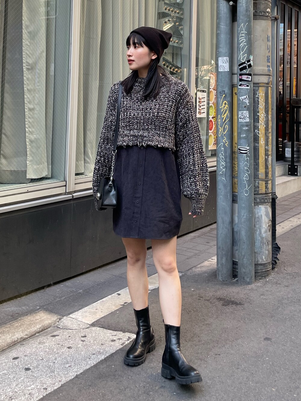 モノトーンカジュアルコーデ! 【ワンピース】メランジ糸を使ったニットが目を引くニットはシャツとドッキングされており、まるで重ね着したようなレイヤードデザインを1枚で楽しめます。着丈も後ろが長めなので、ミニが苦手な方でも挑戦しやすいです。159センチSサイズ着用。 【バッグ】上品な雰囲気のショルダーバッグ。シルバーの金具が目を引くデザイン。マチもしっかりあるので荷物も沢山入ります。どのシーンにもマッチします。 【シューズ】トレンドのサイドゴアブーツ。細身の作りなので足下スッキリと見えます。どのスタイリングにもマッチするので使い回し◎
