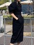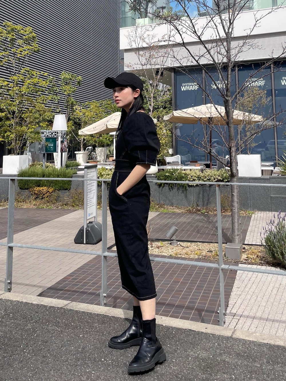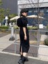 オールブラックコーデ! 【ワンピース】ツイル素材を使ってるのでストレッチ性◎ ギャザースリーブ、タイトラインで女性らしいですが、オールブラックと小物でカジュアルなスタイルに!ステッチが更にカジュアルに仕上げてくれます。