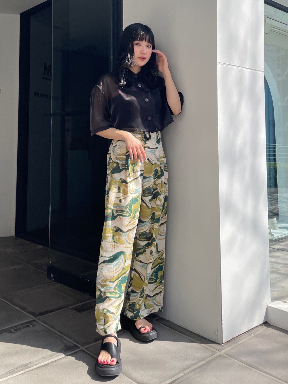 ラフモードコーデ! 【トップス】光沢感のある素材がモードな印象に。人気のシアーシャツの半袖バージョンで更に涼しげに夏お使いできます。 【ボトムス】WEB限定アイテム。サマームードをぐんと上げてくれるペイントプリントがポイント。テロっとした素材でストレスフリーな着心地です。 【シューズ】アシンメトリーがMURUAらしいデザイン。ラフなトングサンダルもモードな雰囲気に。アクティブに動く夏にはもってこいのアイテムです。