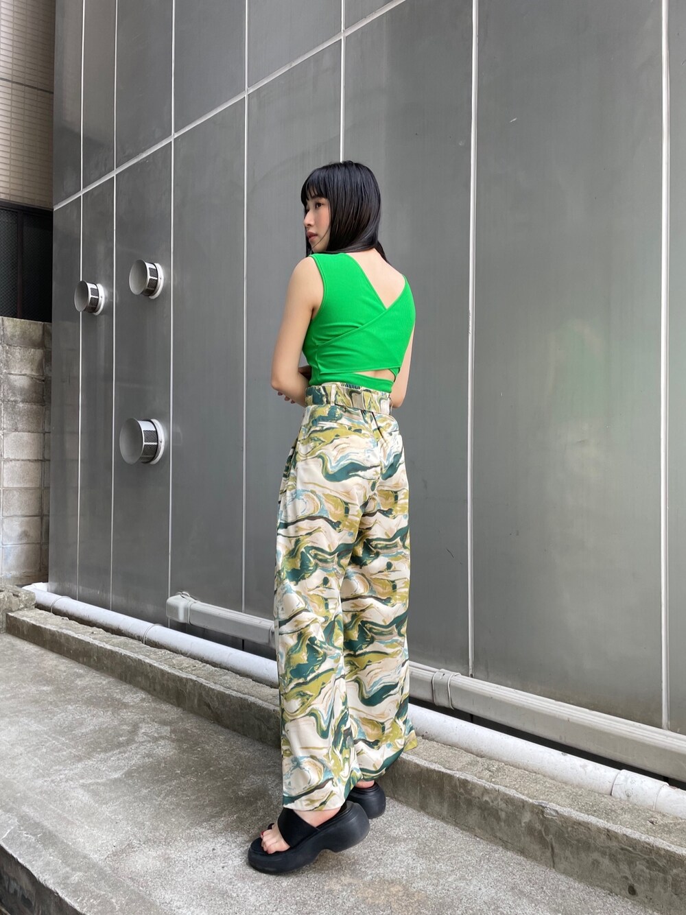 ビタミンカラーの夏コーデ! 【トップス】パット付きのタンクでこれからの季節ヘビロテ間違いなし。体にフィットするタイトなシルエットなので女性らしい仕上がりに。 【ボトムス】WEB限定アイテム。サマームードをぐんと上げてくれるペイントプリントがポイント。テロっとした素材でストレスフリーな着心地です。 【シューズ】アシンメトリーがMURUAらしいデザイン。ラフなトングサンダルもモードな雰囲気に。アクティブに動く夏にはもってこいのアイテムです。