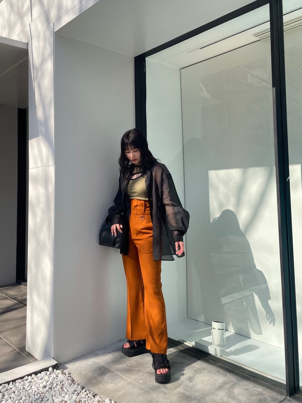 THE MURUAモードコーデ! 【トップス】フロント開きのデザインが抜け感を演出してくれる一枚。肩幅を広めに設定しているので、タイトなシルエットながらも一枚で着て頂きやすいです。 【シャツ】今年も引き続きトレンドのシアーシャツ。微光沢のある素材をミックスさせており、定番ながらも他と差がつく仕上がりに。オーバーサイズで抜け感◎ 【シューズ】毎年大人気のシャカとコラボアイテム。チャンキーソールで盛れる+安定感があり長時間履いてても疲れない優秀アイテム。