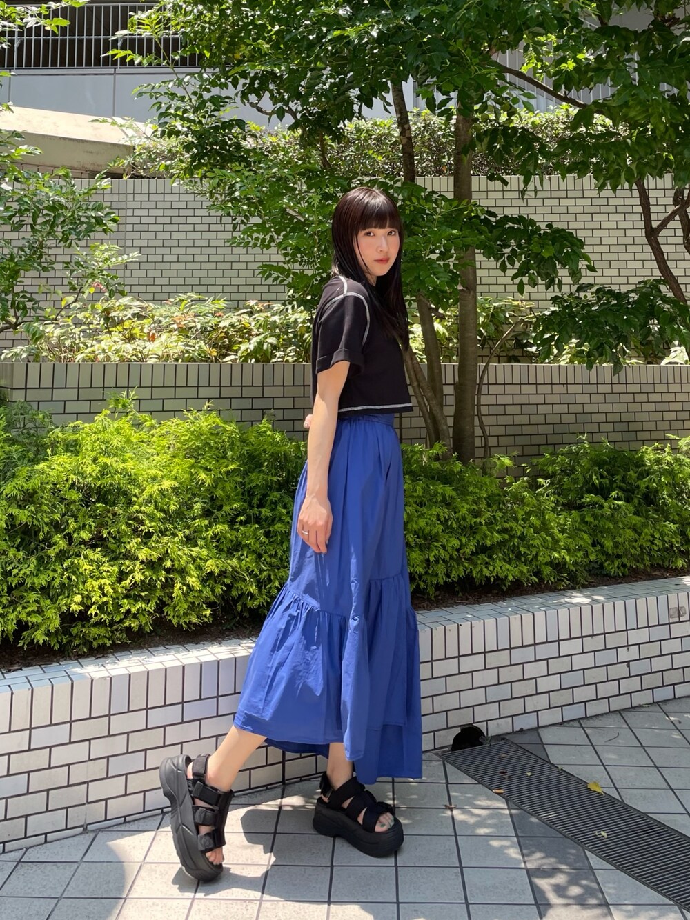 ラフサマーコーデ! 【トップス】柔らかい素材で着心地も◎バイカラーで効いてるステッチがシンプルながらもこなれた雰囲気に。 【ボトムス】トレンドのギャザーディテールがポイントのスカート。コットン素材で涼しくこれからの季節にぴったり。ウエストもゴムなのでストレスフリーでお使い出来ます。 【シューズ】こちらも毎年大人気のシャカとコラボアイテム。チャンキーソールで盛れる+安定感があり長時間履いてても疲れない優秀アイテム。