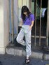 【トップス】バックデザインがポイントのクロップドTシャツ。短丈でトレンド感◎ 【ボトムス】ラフになりがちなジョガーパンツも光沢感のある素材になるだけで上品さをプラス。コーデのアクセントにも◎シルエットも腰周りゆったりめなのでスタイルカバーもしてくれます。