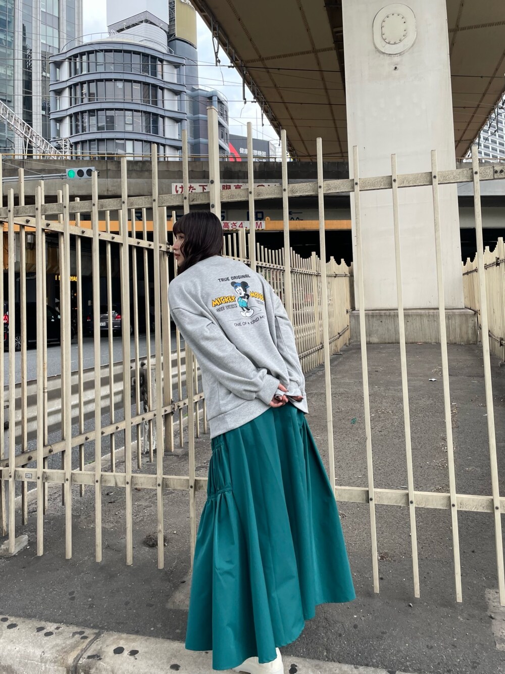 ラフカラーコーデ! 【トップス】ディズニーのスペシャルアイテム。後ろのミッキープリントがポイント。ヴィンテージライクな絵柄がおしゃれな印象に。オーバーサイズでユニセックスでもお使い出来ます。 【ボトムス】アシメにギャザーの入ったフレアスカート。ボリューミーながらも広がり過ぎないシルエットで上品な印象。