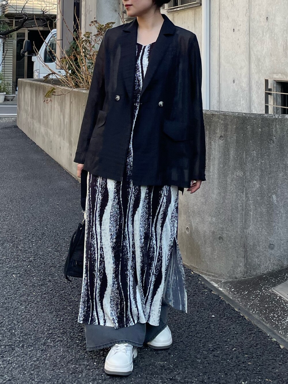 レイヤードモードカジュアルスタイル! 【ジャケット】シアー素材のジャケットで涼しげかつ上級者スタイルに。夏でもお使いできます。 【ワンピース】シワ加工の入ったワンピースで伸縮性◎1枚でヘルシーなスタイルもオススメです。 【ボトムス】ベーシックなワイドデニム。使い勝手良くデイリー使いしやすい一本です。
