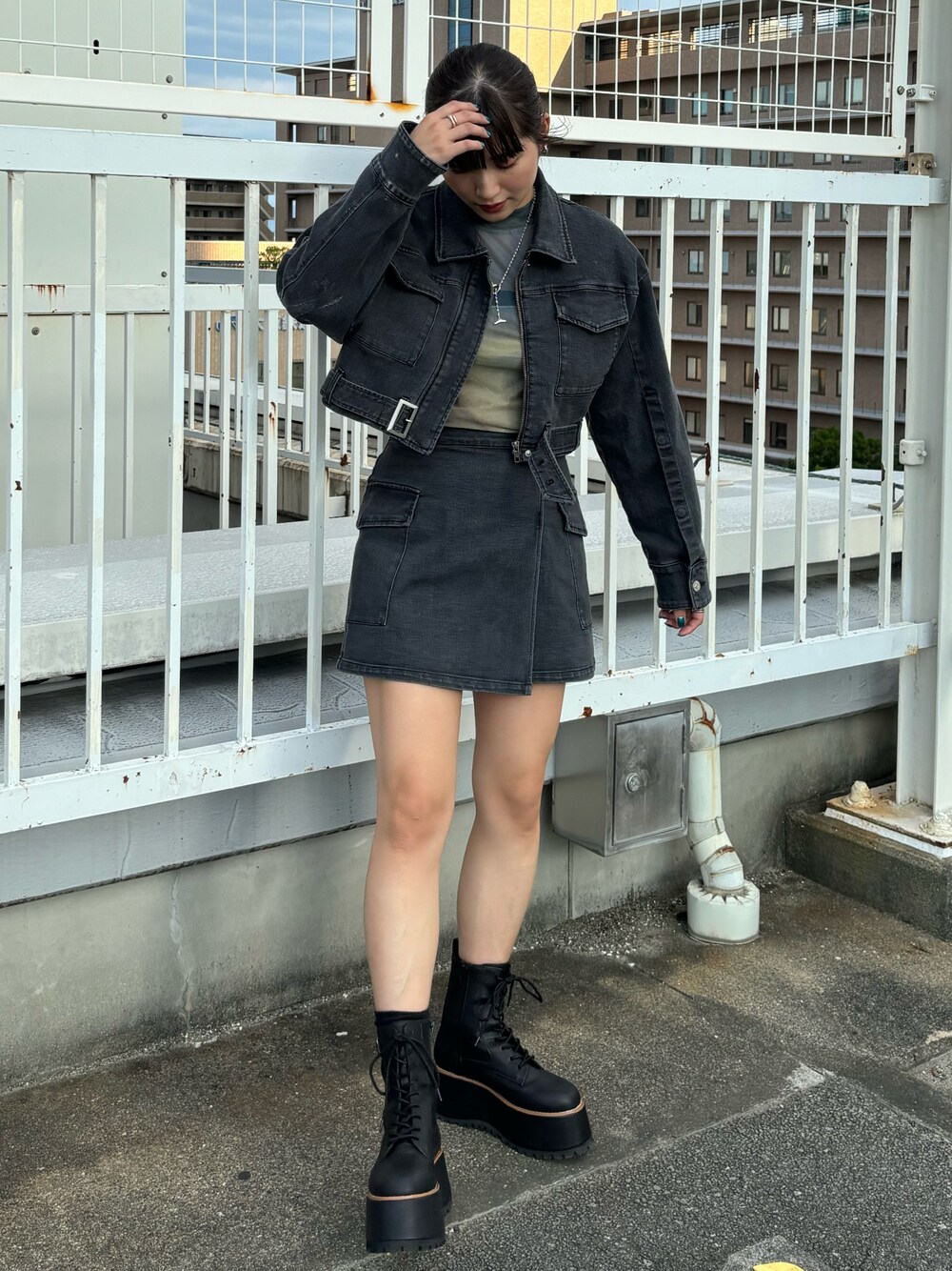 大人気デニムセットアップコーデ! 毎年人気のデニムセットアップ。ジャケットはジャストサイズのクロップド丈でスタイルアップ抜群。袖元はボタンで開けれるようになっており、一癖あるスタイルに。 スカートはインナーパンツがついているので安心です。セットアップのデニムは伸縮性があるので着心地◎ 激盛れ間違いなしのレースアップブーツ。高低差のないヒールで長時間のお出かけにもおすすめです。