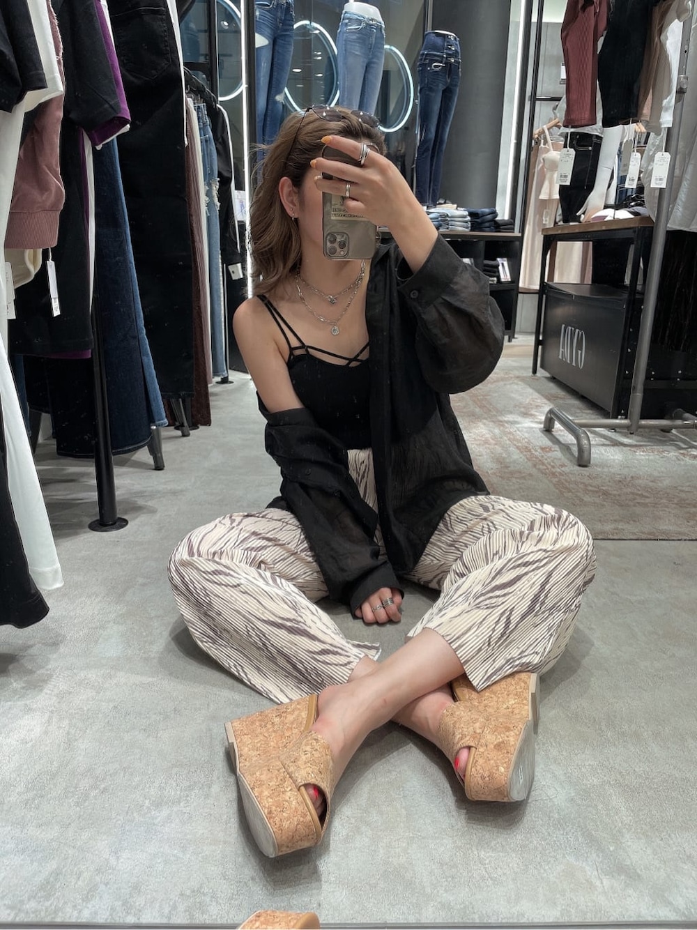 カジュアルコーデに少し強めの女性らしさを出したコーデ❤︎ シースルーSHは程よい肌見せなのでブラックでも重たくならずに着て頂けます。インナーはGYDAで通年人気のバインダービスチェ!バインダーデザインが胸元を綺麗に見せてくれるので、女性らしさをプラスしてくれます。丈間はおへそ上くらいなので、ハイウエストのパンツと合わせてもチラッとお腹が見えてGYDAらしい肌見せも出来ちゃいます! パンツは細めのプリーツが縦のラインを際立たせてくれるので美脚効果抜群のフレアパンツ。ゼブラ柄でも強くなりにくい配色が可愛いですよね❤︎ 160センチの私がヒール無しでも履ける丈間です。素材もサラッとしていてこれからの季節に涼しく履いて頂けます。 アクセサリーはシルバーで統一させて少し強めな印象ですが、ネックレスは大ぶりで揺れるデザインなのでここでも女性らしさをプラスしたポイントになっています♪ シャツもパンツもゆったりとしたシルエットなので、インナーはタイトなものがおすすめです!