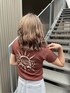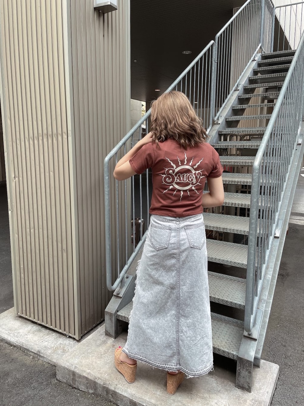 カジュアルなショート丈のTシャツをきれいめに合わせたコーデ❤︎ 毎年人気のショートTシャツ。今回の新色はブラウン!ピッタリとしたシルエットですが、袖口は少しゆとりがあるので二の腕のラインが出過ぎず着て頂けます。カラーバリエーションも豊富なので、お揃いで着ても可愛いですよ〜!インパクトのあるバックプリントなので、ヘアアップすることをオススメします。 スカートは大胆なアシンメトリーのヘムデザインがポイント!GYDAで定番なスカートです。ケミカル加工が周りと差をつけてくれるアイテムで、中にショートパンツが付いているので安心してはいて頂けます。 ポインテッドミュールと合わせてよりきれいめなコーデもおすすめですが、私はシーズンムードを出したかったのでコルクサンダルで合わせました❤︎