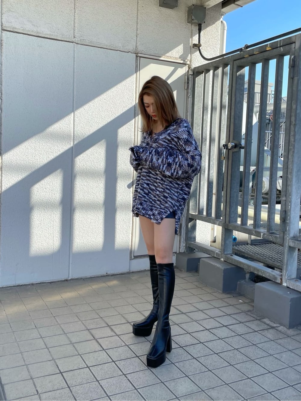 私がカラーに一目惚れしたニットをご紹介❤︎ 【TOPS】トレンドの段染めの糸を使用したニット!糸の特徴を活かした柄見えが新鮮なアイテムです。 深めのVネックにGYDAらしくグラインダーダメージになっているので、私はインナーでバインダーキャミを着ています!ゆったりとしていてストンとしたシルエットが可愛かったので、私的にはデニムよりショーパンやスカート合わせがおすすめです! 横のスリットや袖もポイント❤︎ 【スカート】毎年大人気のフェイクレザーSKライクSPTです。タイトミニシルエットですがスカートライクショーパン仕様なので、安心して着用できるのがポイント。160cmでSサイズを履いていますが、丈感は短めです。ベルトループが付いているので、丈感心配な方はMサイズでウエストはベルトをするのをおすすめします! 【ブーツ】ストレッチのきいたフェイクレザーを使用し、柔らかく柔軟性に優れたロングブーツ。 柔軟性はありますが、ふくらはぎ周りは特にタイトになっていますよ!ストームも高く、美脚効果とともに歩きやすさも抜群です。