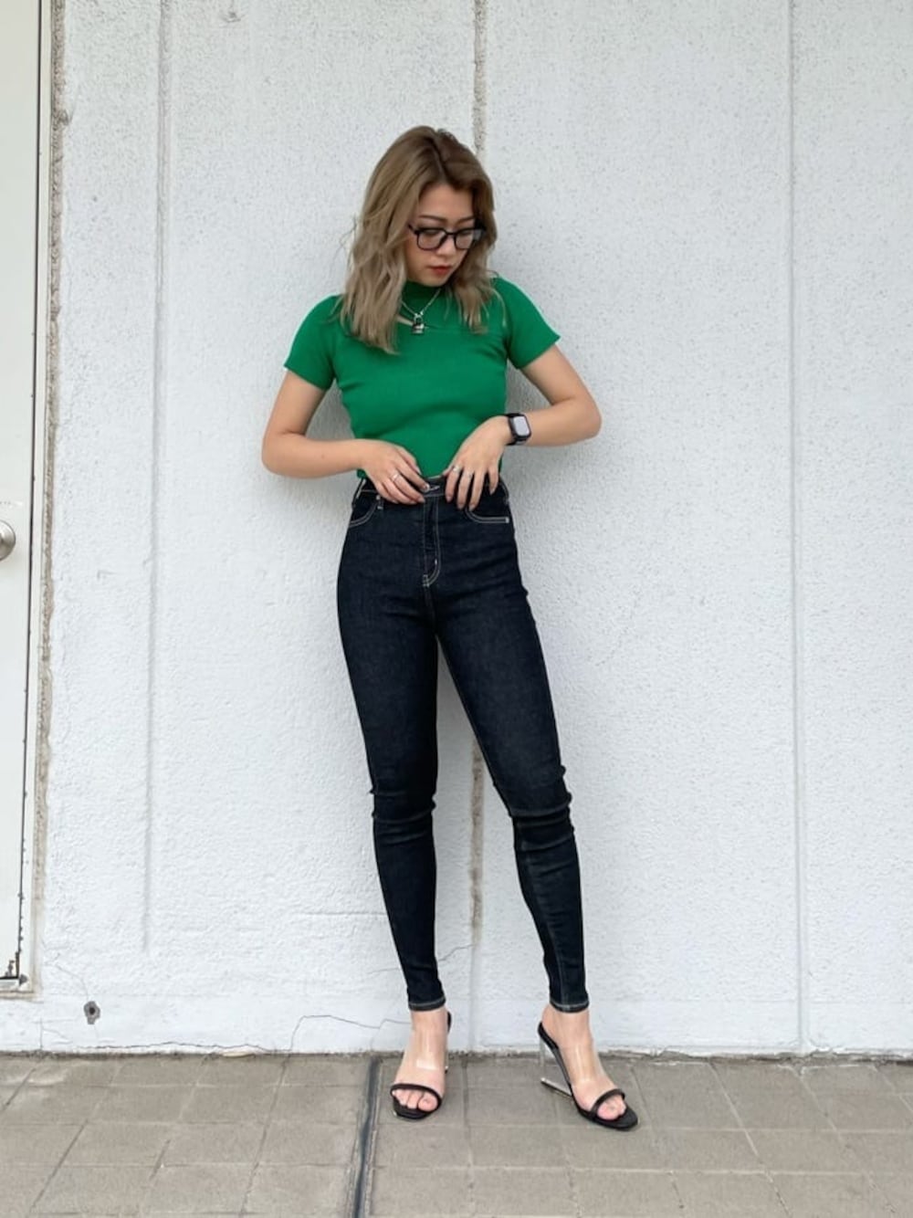 トレンドカラーを使ったきれいめカジュアルコーデ❤︎ 【TOPS】トレンドのグリーンカラーを含んだ3色展開になっています。デコルテから胸上にかけてカットデザインがされていて、GYDAならではの肌見せが出来るTOPSです!タイトなシルエットで肌にピタッとフィットしてくれます。 【スキニー】伸縮性に特化した神スキニー!!ワンサイズの作りですが、体型、体格問わずどんな方にでも履いて頂けるくらい伸縮性があるスキニーです。スキニーの概念を覆すくらい伸びます!伸びたら伸びっぱなしではなく、戻る力もちゃんとあります。履き心地が良く私も購入しました❤︎ 【サンダル】クリアサンダルって靴擦れするイメージありませんか?このサンダルはクリア部分がとっても柔らかいので私は靴擦れすることなく履くことが出来ました!華奢なラインが強調する様に、足先のラインは細くし、足の甲は、太めのデザインになっています。私は24.0センチの幅広めなのでLサイズを履いています!