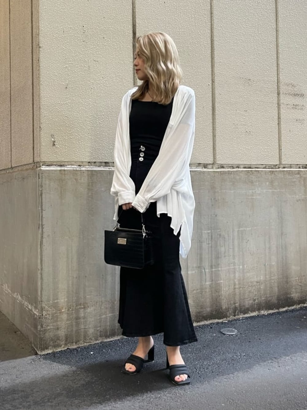 マーメイドスカートをきれいめカジュアルコーデに❤︎ 【シャツ】毎年人気の楊柳シャツ。サラッとした肌触りで、羽織り・肩掛け・手持ちとこれからの季節に活躍するシャツです!お洗濯後もアイロンなどかけずに着て頂けるので、お手入れも簡単なのこともおすすめポイントのひとつです!シンプルなデザインなのでどんなコーデにも合わせやすいですよ。丈感は長く、ドルマンっぽく袖周りもゆとりがある作りになっています。 【TOPS】バックスタイルがレースアップになっているカップ付きのTOPSです。伸縮性がありとっても着やすかったですよ! 【スカート】トレンドのマーメイドスカートをGYDAらしくニット素材ではなく、デニムスカートとして発売!マーメイドスカートはきれいめコーデを簡単に組むことが出来ますが、きれいめコーデになりすぎる為私自身苦手意識があったのですが、今回はデニムスカートなのでカジュアルに使えるので私でもコーデに取り入れることが出来ました!!伸縮性もあり履きやすく、美脚効果抜群のアイテムです。 【サンダル】スポンジに包まれているかの様なクッション性で、履いた瞬間感動しました!通常のサンダルに比べて少しだけ足の甲の部分が肉厚なので足幅が広い方はワンサイズ上げて履いてもいいかなと思います。 私は足幅が広い方なので24.0センチでLサイズを履いています。