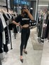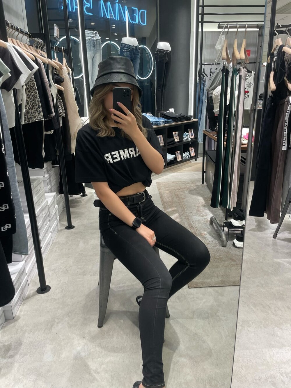 夏のオールブラックコーデ❤︎ 【TOPS】胸元のロゴにスタッツが付いた私もリアバイしたTシャツです!丈感は160センチでお尻が隠れるくらいですが、オーバーサイズすぎないのでパンツインもしやすいですよ。スタッツは柔らかくまたロゴと同系色なので、主張しすぎず着回しも◎です。私はTシャツアレンジをして、織り込んで夏らしく肌見せしました! 【スキニー】GYDAで定番人気アイテムのひとつです。ストレッチ性が高く、柔らかいスキニーです。とにかく履きやすく、リピートで買われる方が多いです!普段のデニムより、伸縮性があるのでワンサイズ下がる方が多くいます。ホワイトステッチも3センチ内側にデザインされているので、脚長効果もありますよ! 【ミュール】GYDAで定番のポインテッドミュール。デニムとの相性が特に良く、足が綺麗に見えるようにヒールの高さなど拘ってデザインされています。私は24.0センチで足幅が広いので、Lサイズを履いています! 【ハット】大人気のGGの総ロゴデザイン!!フェイクレザーの素材になっています。コロンとしていて、ベーシックな形なので、普段バケットハットをかぶらない私でも挑戦しやすかったです!