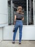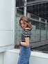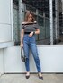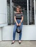 きれいめカジュアルコーデ❤︎ 【TOPS】シャリ感のあるサマーニットの素材TOPSです。少し透け感があり、左肩にGGボタンが付いているのがポイント!2WAYの着こなしが出来る万能なTOPSで、キレイめにもカジュアルにもコーデを組みやすいアイテムですよ!おへそ上の着丈になっています。 【デニム】ノーダメージのデニムですが、後ろのベルト部分に刺繍デザインが施されているのがポイントです!ペグトップと言われる洋梨型のシルエットで、太もも部分が1番太く作られているため脚にコンプレックスをお持ちの方でも履いて頂きやすいアイテムです。スキニーとは異なり、わざと緩く履くのも可愛いのでお好みでサイズを上げるのもいいかと思います!裾をロールアップしても可愛いですよ〜! 【ミュール】GYDAで定番のポインテッドミュール。デニムとの相性が特に良く、足が綺麗に見えるようにヒールの高さなど拘ってデザインされています。私は24.0センチで足幅が広いので、Lサイズを履いています!
