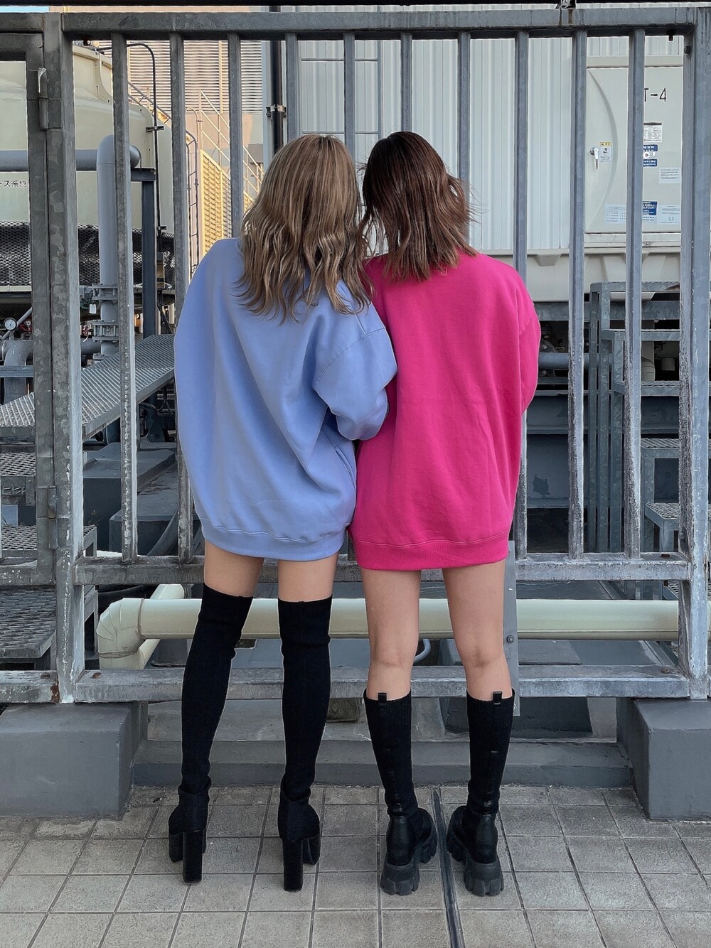 お揃いカラーコーデ❤︎ 【TOPS】裏起毛のオーバーサイズのスウェットTOPSです!一枚で着用すると160センチの私たちでもワンピースっぽく着て頂ける丈感でした!後ろの衿ぐりに同色で入ったGG刺繍がポイントの、カラーバリエーション豊富のアイテムです! 【ブーツ:左】これからの時期には欠かせない厚底のニーハイブーツは、ソックスブーツなのて履きやすくデニムと合わせる事も出来るアイテムです!厚底なので、高低差が少なくとっても歩きやすくて美脚効果抜群です!24.0センチでMサイズを履いています! 【ブーツ:右】GYDAで大人気のブーツで、ソール部分がボリュームがあるので足が細く見えるブーツです!ソックスブーツなので、靴擦れもしにくく長時間履いていても楽チンですよ!リブ部分がしっかりしているので、落ちてきにくいです!23.5センチでMサイズを履いています。