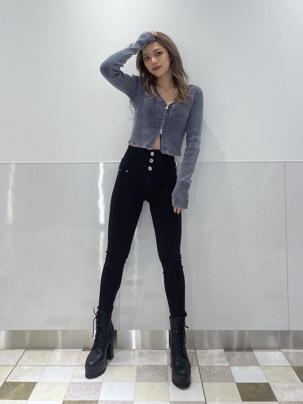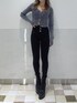 カジュアルコーデ❤︎ 【TOPS】 トレンドのダブルファスナーデザインで、GYDAらしいブリーチ加工がされてるニットです!おへそにかかる丈感なので、ハイウエストのボトムスと合わせるとスタイルアップして見えますよ♪タイトなニットですが、伸縮性があって着心地もいいニットです。袖にはサムホール付きなのもポイントです! 【デニム】店頭で大人気のハイウエストのスキニーデニムです!ノーダメージですが、後ろがクロスになっているデザインがシンプルすぎずワンポイントになってくれます。3つボタンのハイウエストですが、おへそにかかるくらいのウエスト位置なので、低身長の方でも履きやすいデザインです!160センチでXSサイズを着用しています。 【ブーツ】ヒール部分がゴツゴツしているタンクソールは、安定感があり、脚が疲れにくいうえに美脚効果があります!着脱は横のファスナーでして頂くので、楽チンですよ!24.0センチでLサイズを履いています。